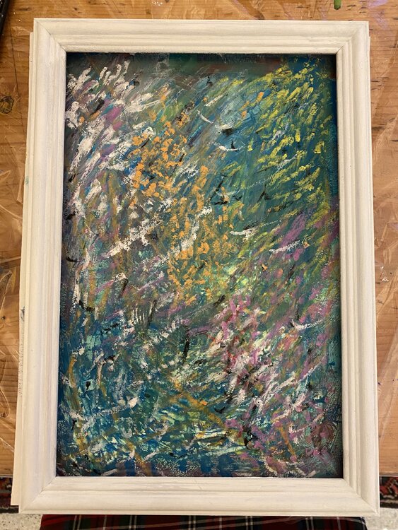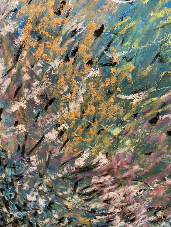 Abstract artwork on paper. Spring mood. Medium: acrylics and oil pastels. Artist has been inspired from the new season. Colors are the sale you can see in nature at Springs time.