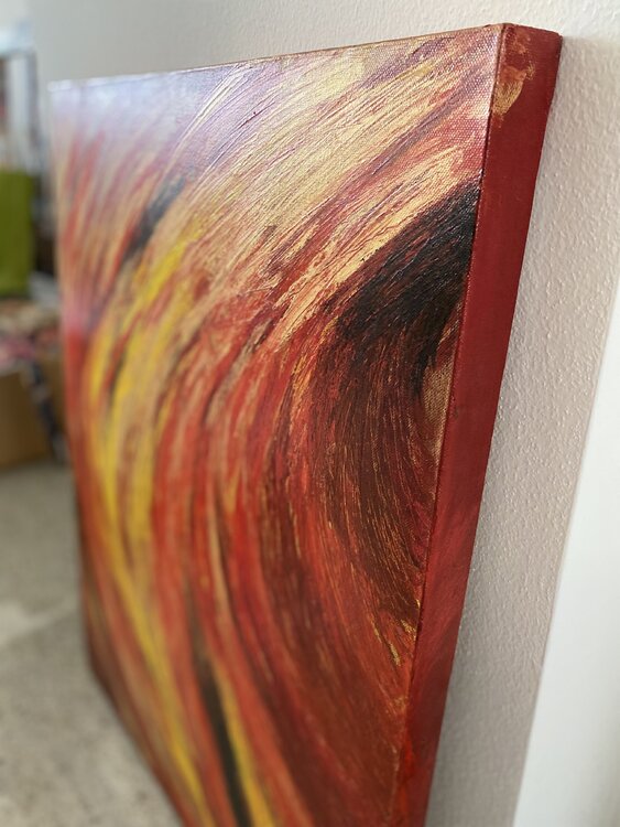 The artist tried to transfer into the canvas all the energy and passion that she felt . The strength of this energy is underlined by the choice of very vivid colors: Red and Yellow alternating with Gold. Small dark areas give depth to the composition. The artist wanted to give a stylistic characteristic by using Gold, in fact the work takes on iridescent reflections depending on how it is struck by the light.