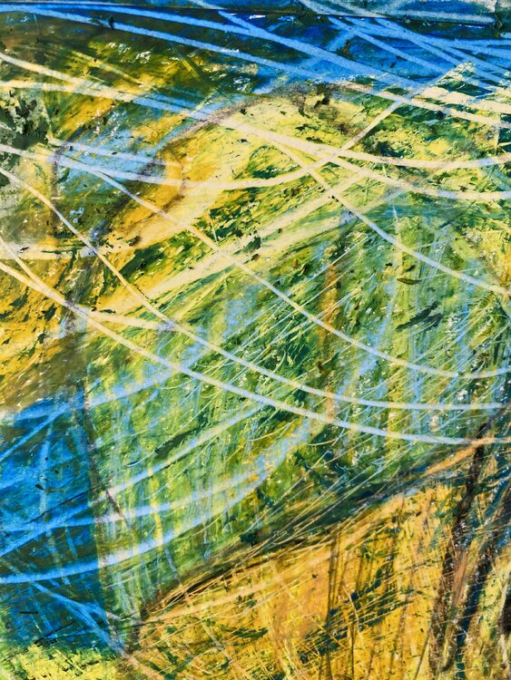 The artwork is about the special feeling the artist lives during the summertime, when the power of the sunlight is stronger than ever and gives power to all the rest of the nature: green mountains, blue sees and yellow sand and gold fields.