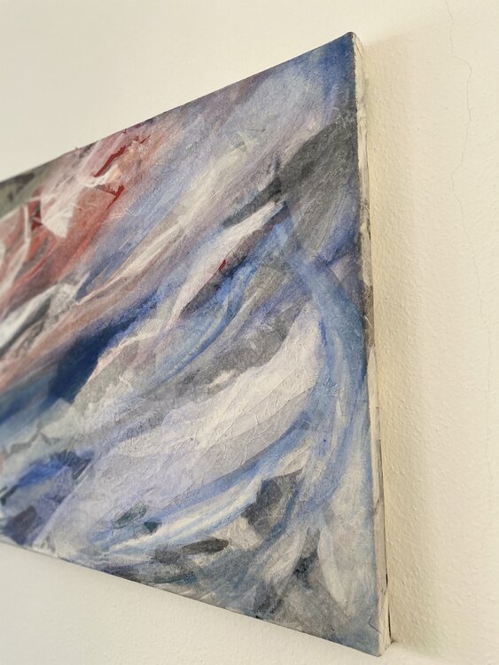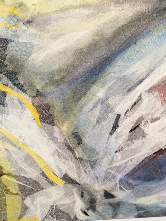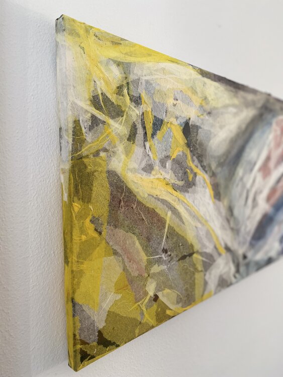 The artist has used a mixed tecnique of a collage parer and acrylic on canvas.