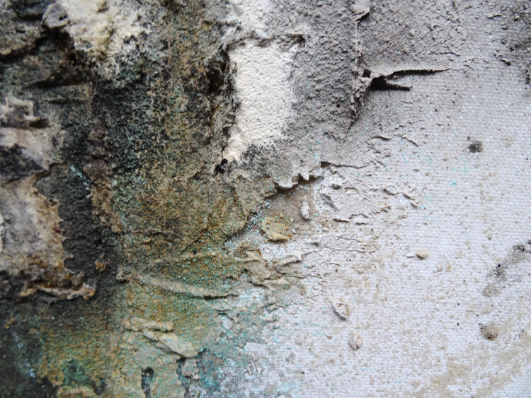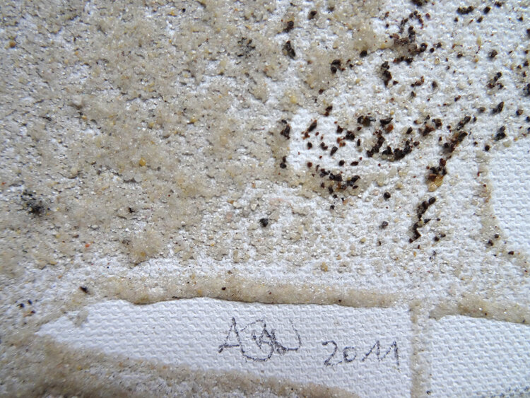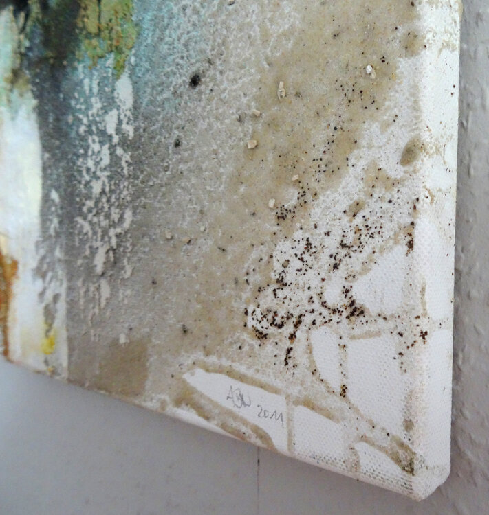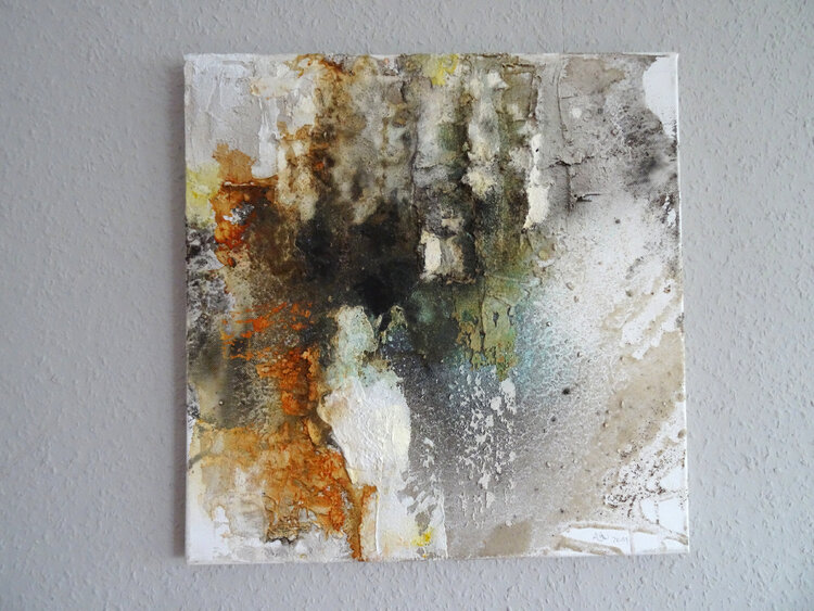 This picture is made with structural materials such as marble powder, pigments, coffee powder, etc. The artist Angelika Biber is thus engaging in a random, unpredictable process that can hardly be planned. A process that takes place in layers and leaves plenty of room for experimentation. The strong three-dimensional reliefs give the picture a lot of depth, but the coloring and the blown pigments make the work seem light. The warm colors can be combined1