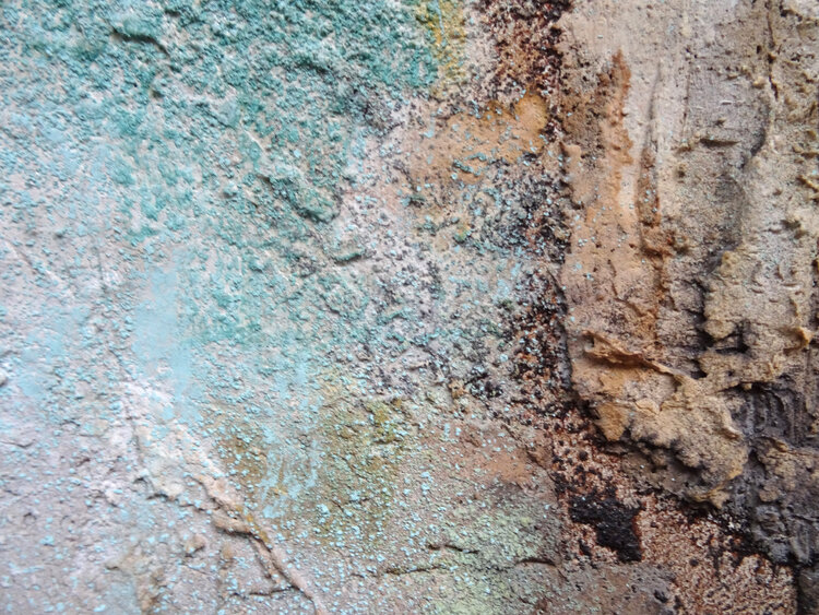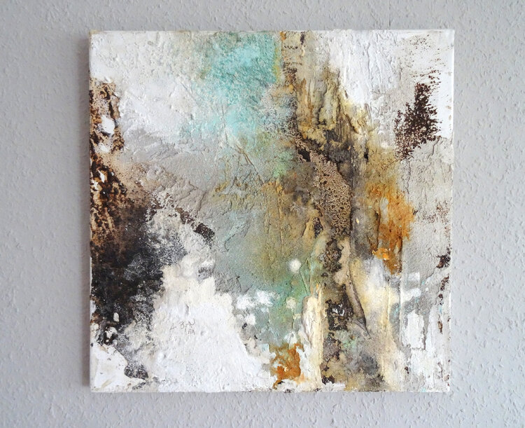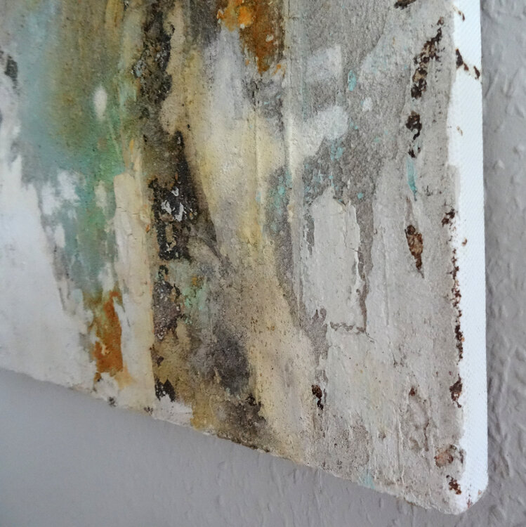 This picture is made with structural materials such as marble powder, pigments, coffee powder, etc. The artist Angelika Biber is thus engaging in a random, unpredictable process that can hardly be planned. A process that takes place in layers and leaves plenty of room for experimentation. The strong three-dimensional reliefs give the picture a lot of depth, but the coloring and the blown pigments make the work seem light. The warm colors can be combined1