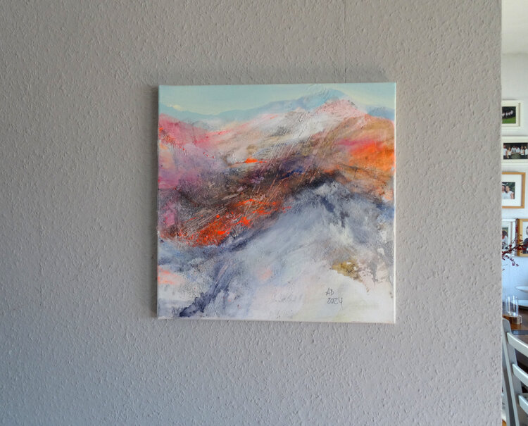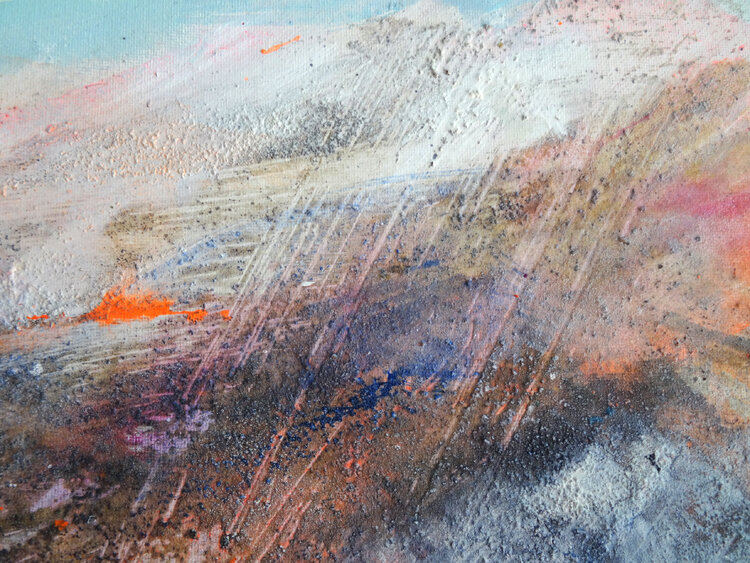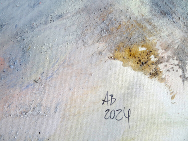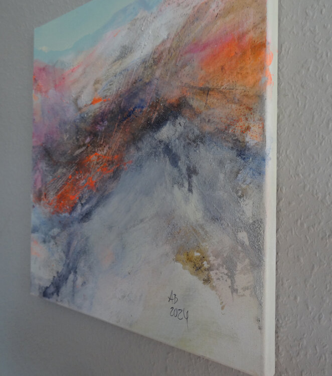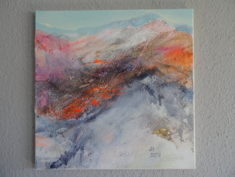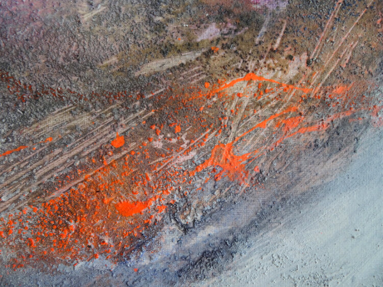 This abstract landscape is an experimental structural work using sand, ash, champagne chalk and marble dust. The structures were applied freely and unplanned with a broad painting knife. The liquid color is only added later: glazes made from acrylic paint, ink and Aerocolor run into the recesses without taking away too much of the structures. So the picture remains light and airy, with a lot of randomness. The color scheme is complementary, with1