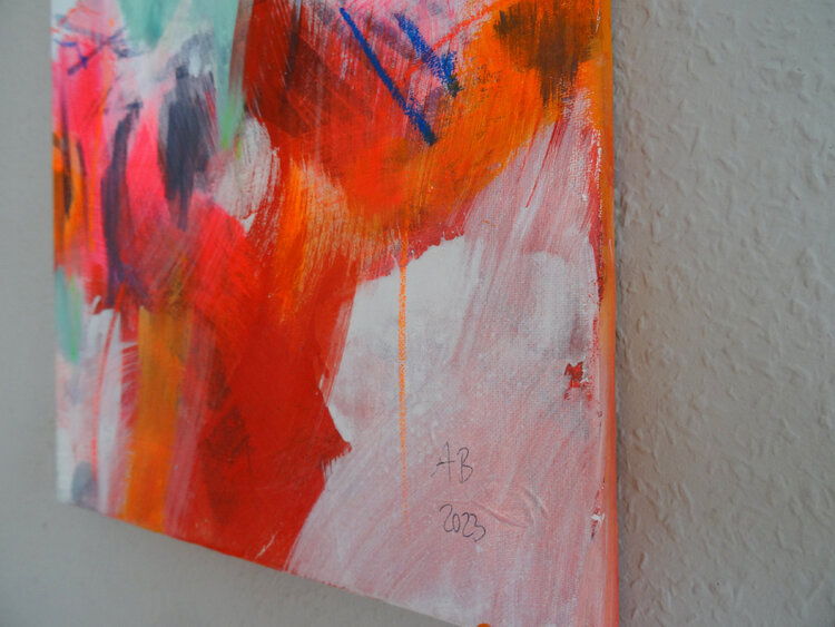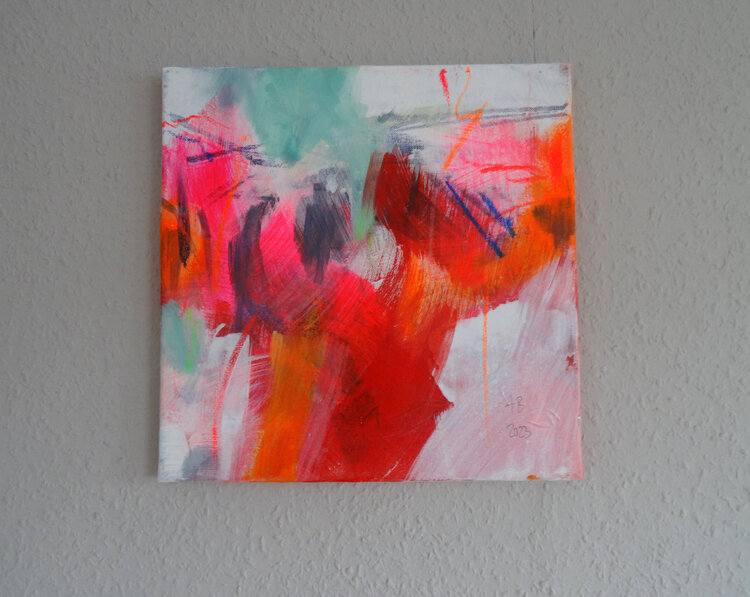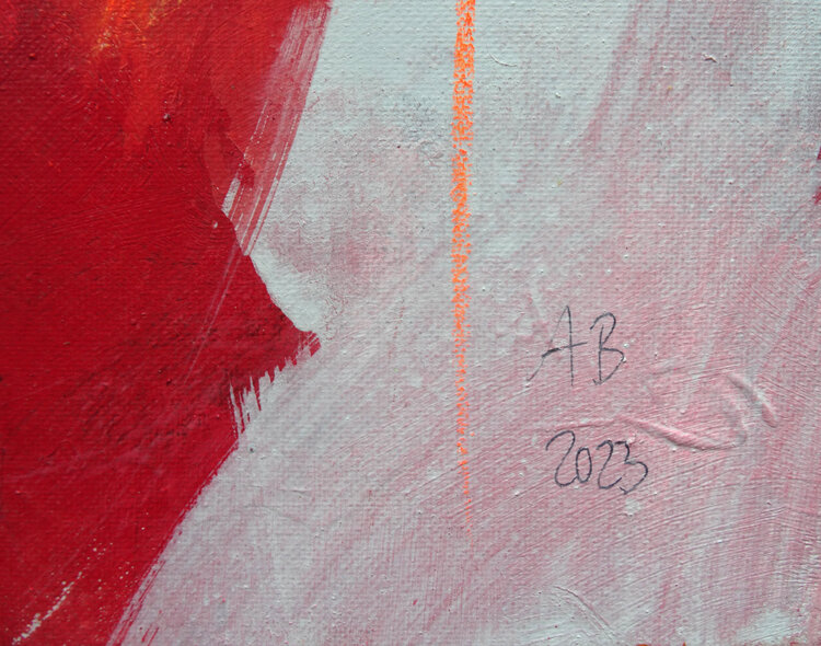 Abstract work with gestural curves, intensely colored and luminous. Angelika Biber's painterly signature is a dynamic brushwork and fresh color worlds, paired with a fine graphic play of lines. Contrasts also play a major role here. The angular forms in this work are very expressive and seem to protrude beyond the picture format. A very lively, dynamic work.