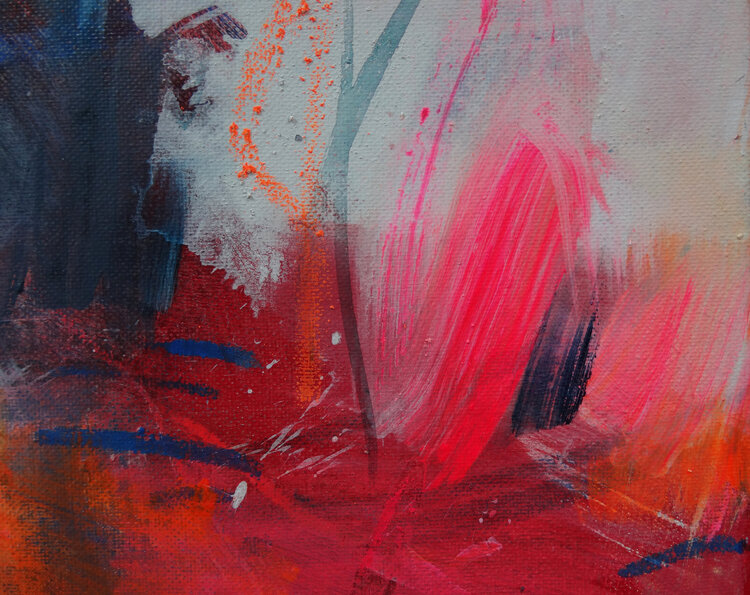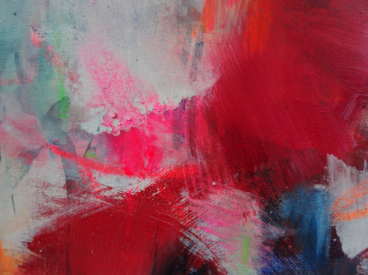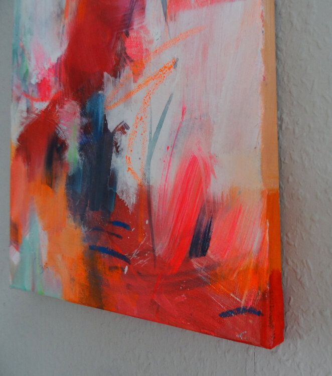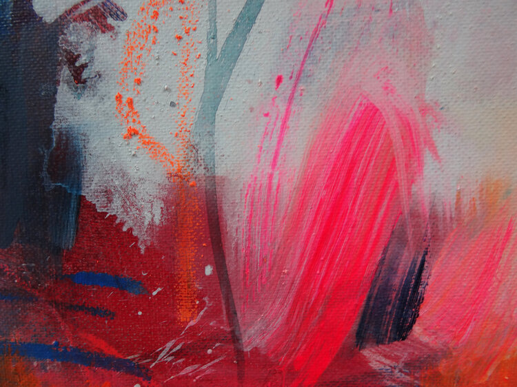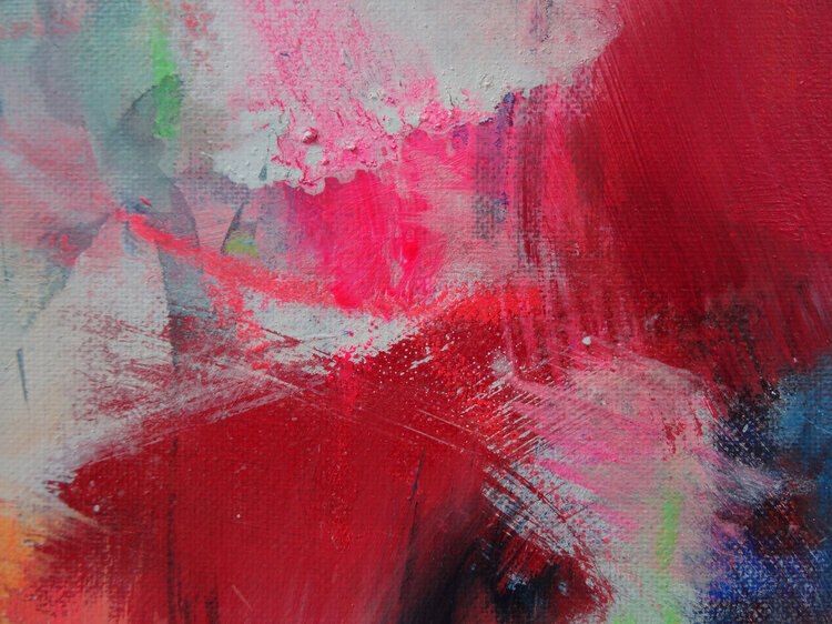 Abstract work with gestural curves, intensely colored and luminous. Angelika Biber's painterly signature is a dynamic brushwork and fresh color worlds, paired with a fine graphic play of lines. Contrasts also play a major role here. The angular forms in this work are very expressive and seem to protrude beyond the picture format. A very lively, dynamic work.