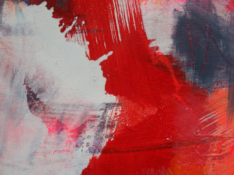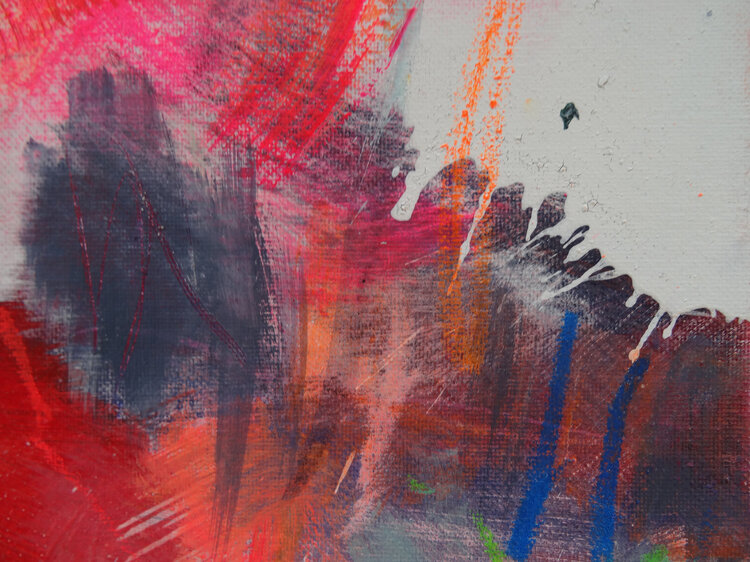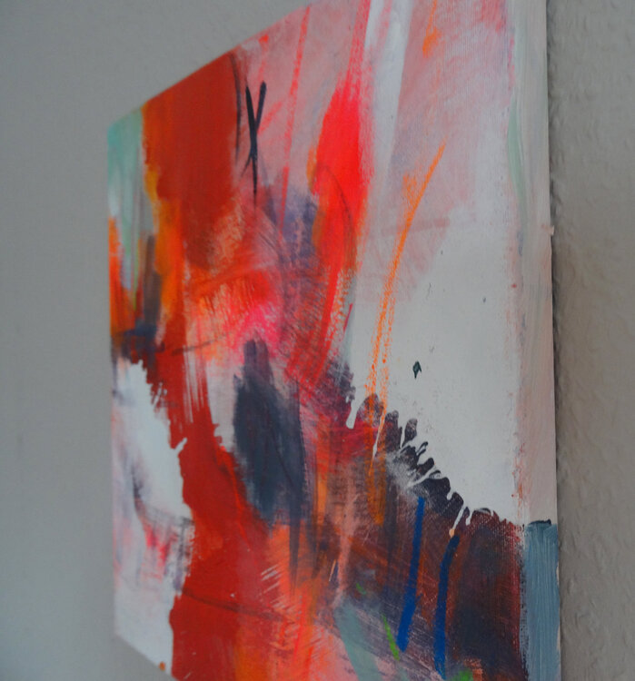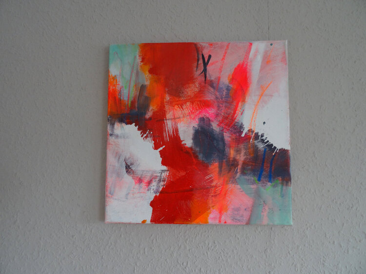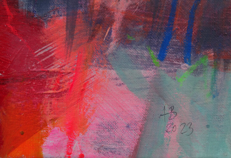 Abstract work with gestural curves, intensely colored and luminous. Angelika Biber's painterly signature is a dynamic brushwork and fresh color worlds, paired with a fine graphic play of lines. Contrasts also play a major role here. The angular forms in this work are very expressive and seem to protrude beyond the picture format. A very lively, dynamic work.