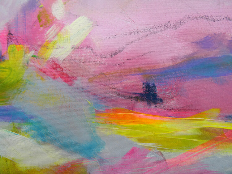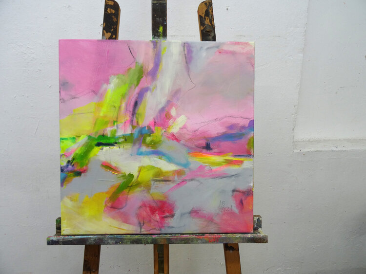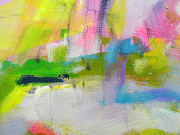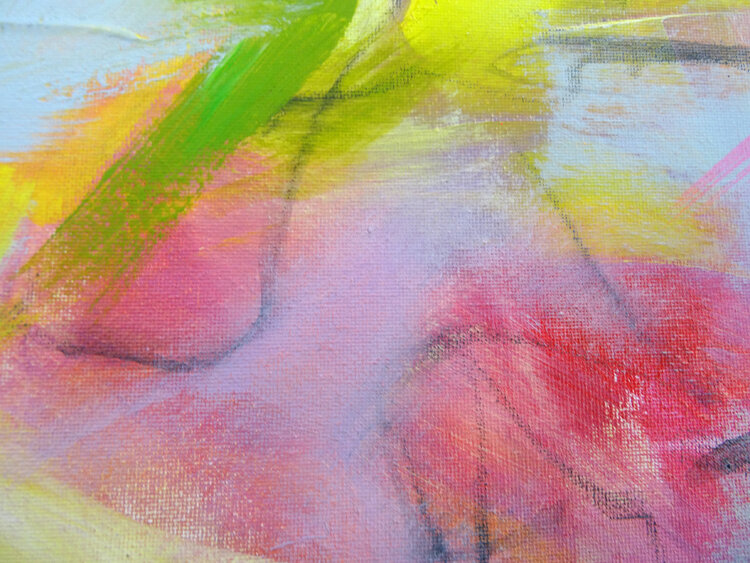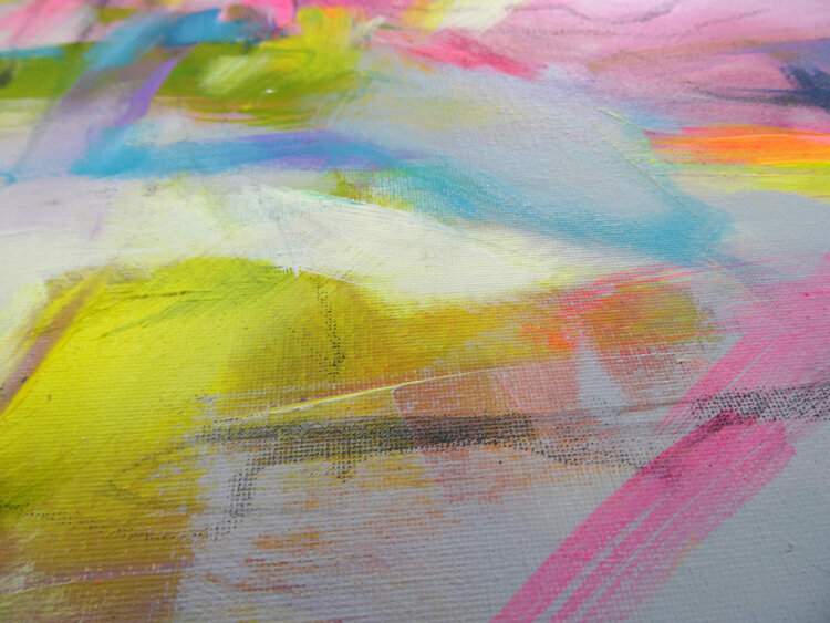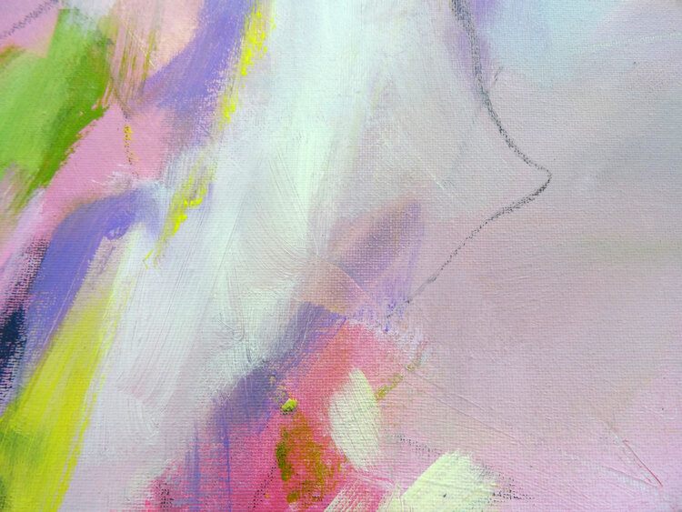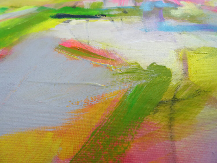 Abstract work with gestural curves, intensely colored and luminous, with a beautiful broken complementary contrast. Angelika Biber's typical combination of gestural color surfaces alternating with a fine play of lines is also evident here. Pastel shades and broken gray shades complement each other to create an exciting color tone. Neon-colored accents are added to enhance the color.