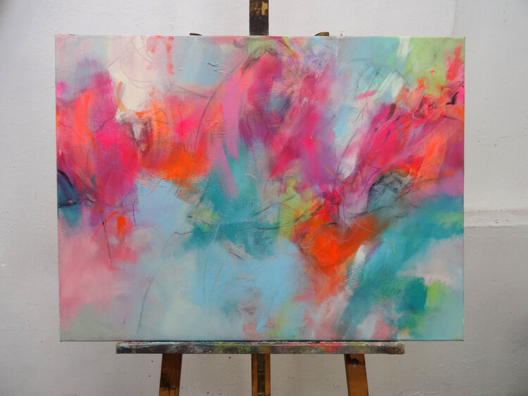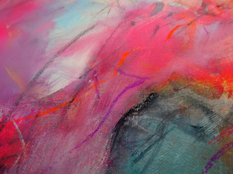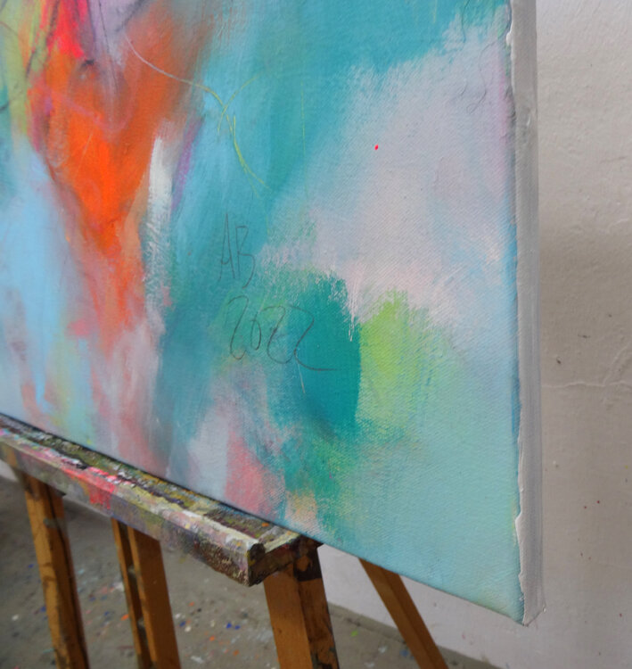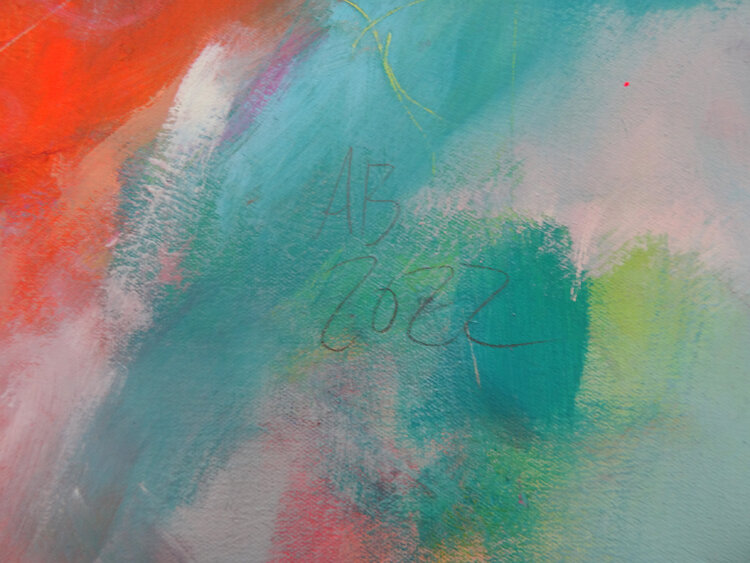 Abstract work with gestural curves, intensely colored and luminous. Angelika Biber's painterly signature is a dynamic brushwork and fresh color worlds, paired with a fine graphic play of lines. Contrasts also play a major role here. The appearance of the picture is abstract, organic and floral.