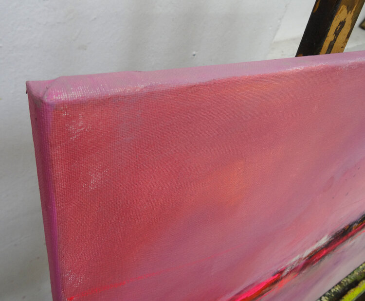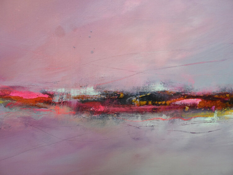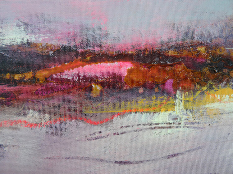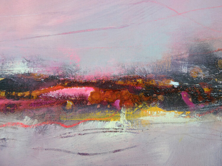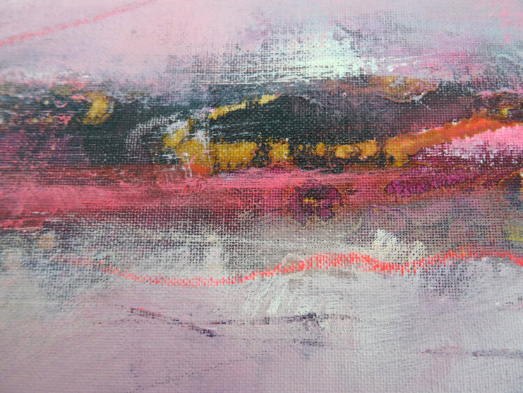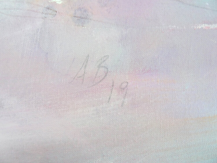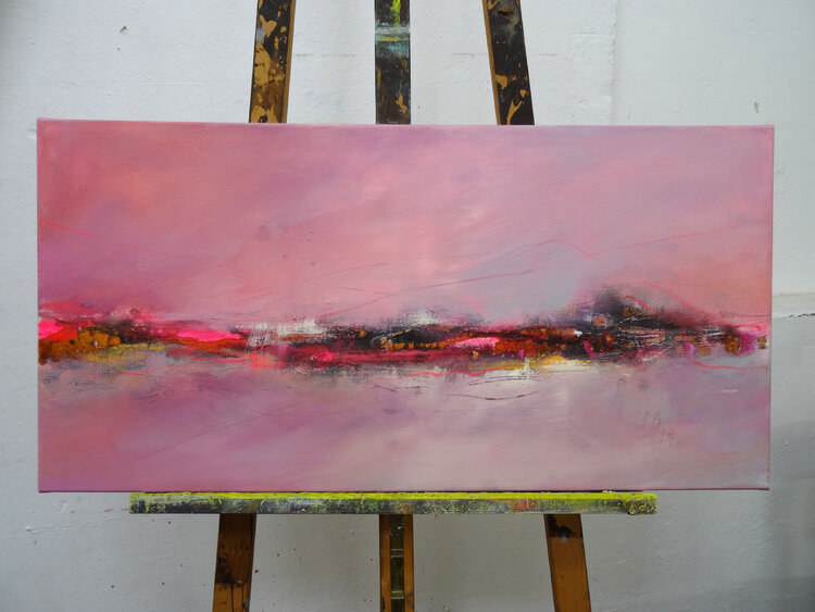 A glow seems to emanate from this abstract horizon, coming from the depths. The artist Angelika Biber likes to work with experimental materials and techniques that produce random structures. She then incorporates these structures into the further design, some of them are left as is, some of them are reworked with calm areas of color so that the composition remains clear. Special moods, special lighting situations that bring atmosphere into the picture1