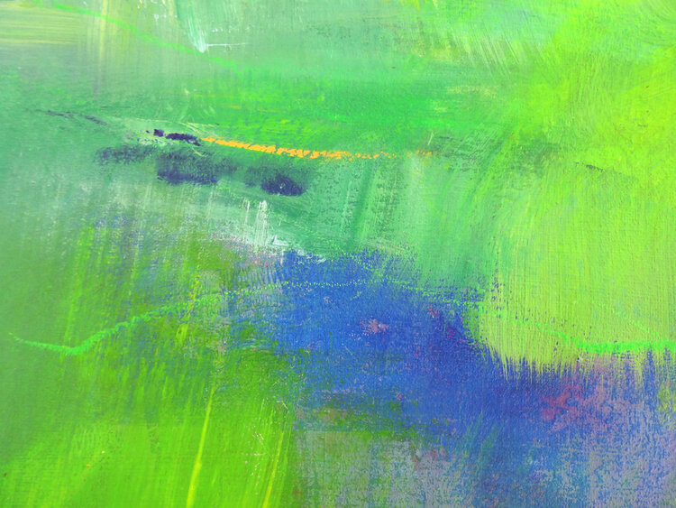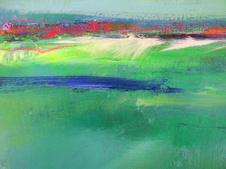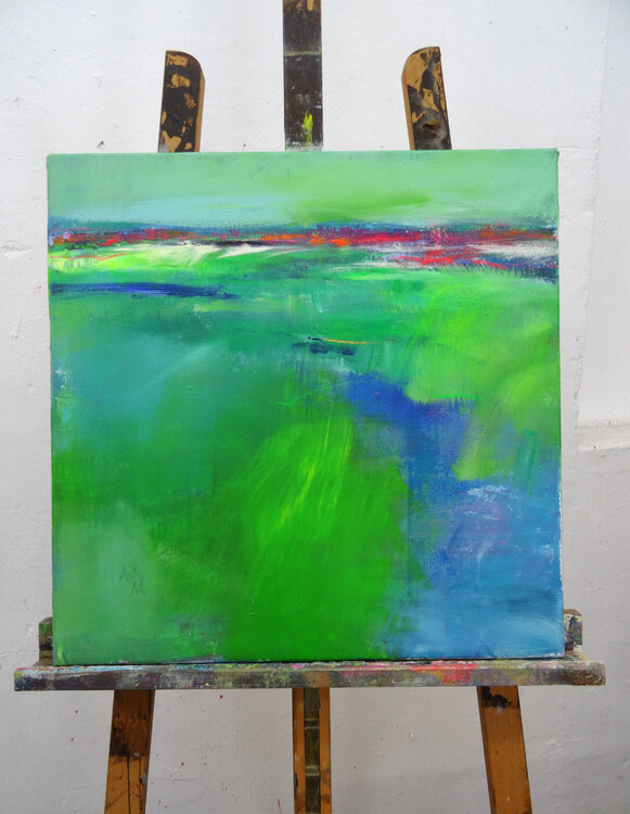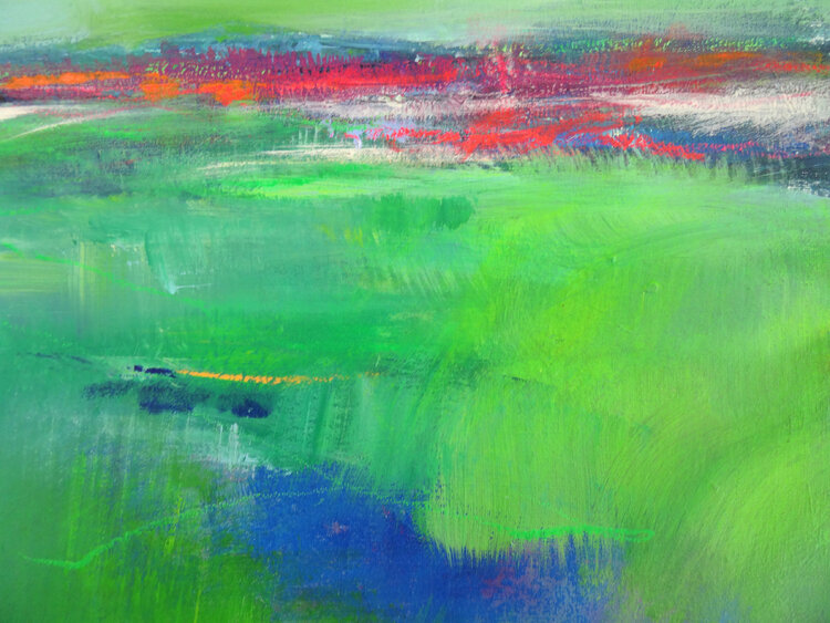 Abstract, colour-intensive horizon, which is arranged very high in the picture format and therefore brings great depth to the picture. Complementary color tones further increase the contrasts. This very abstract form of landscape representation leaves the viewer plenty of scope for their own imagination.