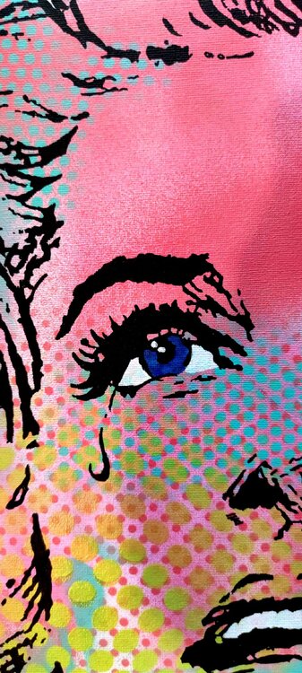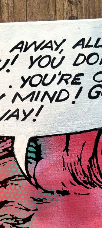 Based on the great works of pop artists such as Mel Ramos or Roy Liechtenstein, here is another modest contribution to beautifying your home: "Go away, all of you"! The attractive young lady in sheer desperation...why? That is left to the exuberant imagination of the viewer. Art leaves room for interpretation, at least that's how I see it. The painting is part of a series about women, please see my other paintings and make up your own mind: Can I1