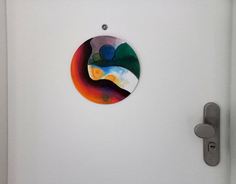 Everything round - an abstract work on painting cardboard (30 cm diameter) painted with different techniques: ink, pastel and acrylic.