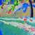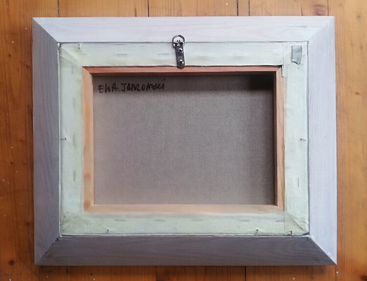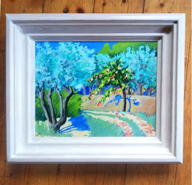 Autumn in Provence. Olive and apple tree. The leaves of the olive tree shimmer in the autumn sun. Ripe apples fall under the tree. The grass is losing its lush green. “Painted with both ends of the brush”. In the last phase, the painting is covered with varnish. Wooden frame 35x 41 cn, lacquered.