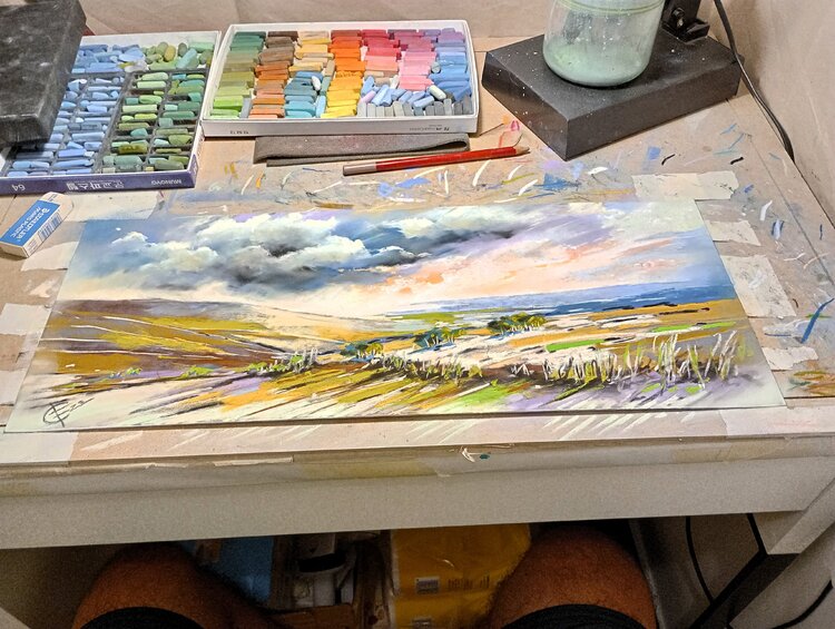 The subjects I choose to 'interpret' are from photos or live. After a few sketches I choose the colors and the surface. The surfaces I use vary according to the quality of the pastels and the effect I wish to achieve. With a dry pastel I quickly draw the main elements. After that, I apply the color with wide strokes, filling the previously drawn areas. I blend the colors directly with my fingertips. In fact, I don't use smudge or other tools. I like1