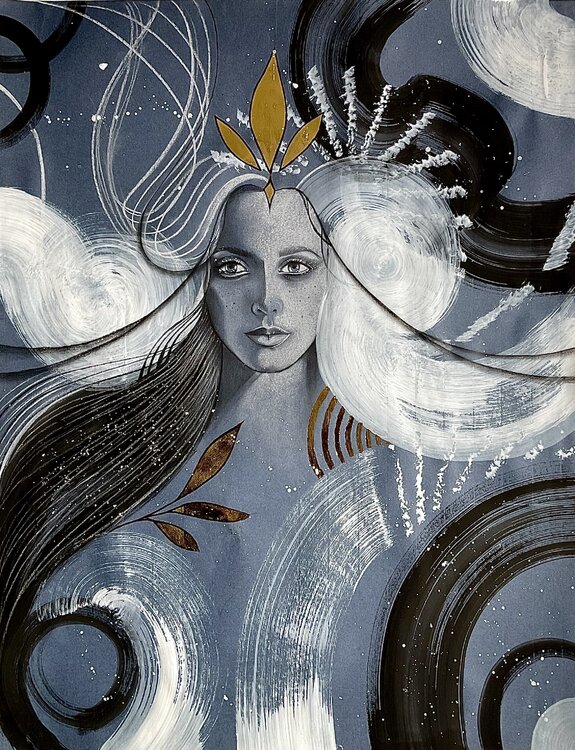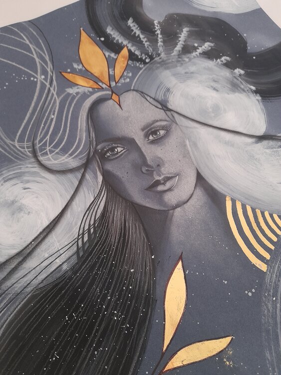 “Dreams dance around us like invisible currents, like hair swaying in the waters of a boundless sea” Mixed techniques with gold leaf on indigo blue paper Canson Mi Teintes 50x70 Original work by Francesca Barretta