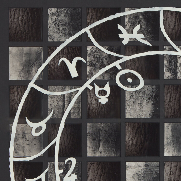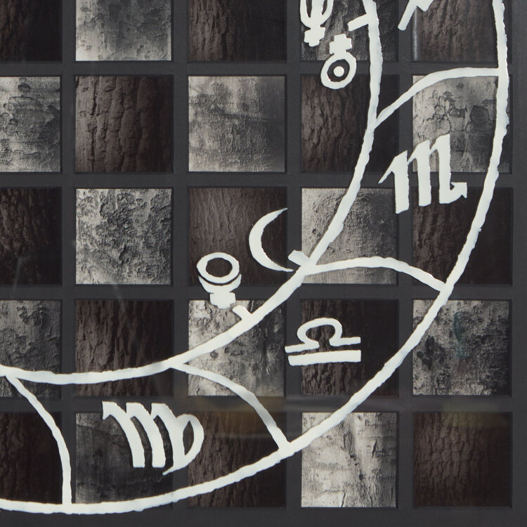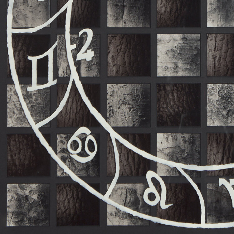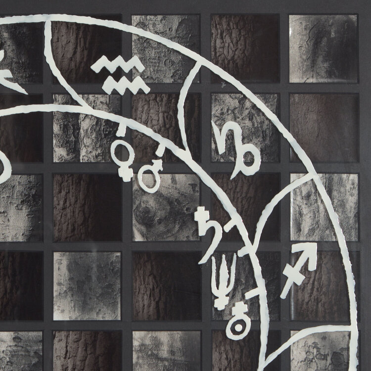 This work took a few days short of a year to complete. I photographed the trees in Plänterwald in Berlin last March. The white squares are beech, photographed during the day on the 5th of March. The black squares are oak, photographed on the night of the 7th of March. I printed the squares that month, then toned them in Sulphide in June. The photographs were then mounted individually – till finally, in March 2021 I was able to paint my natal chart1