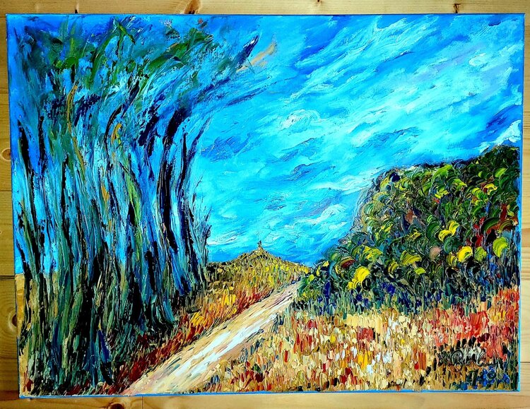 The work was painted onto a canvas using a spatula technique with oil paints.