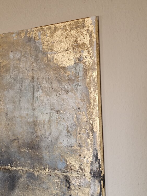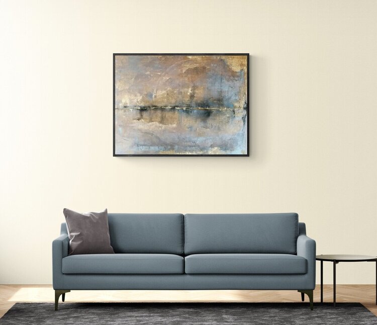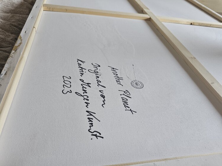 The painting "Another Planet" shows an abstract landscape on a mysterious planet. The scene is barren and unreal, but it still exudes a certain calm and beauty. Golden accents give the image a touch of mystery and elegance. The painting is perfect as an eye-catcher in a modern interior and comes with an elegant black wooden frame.