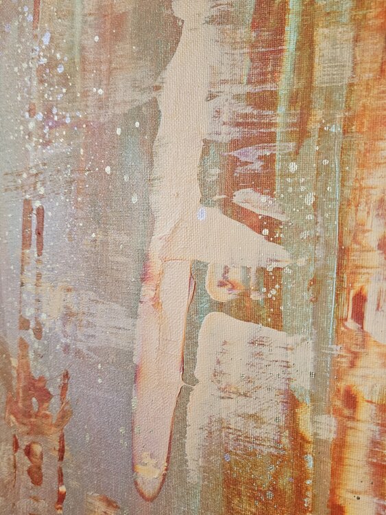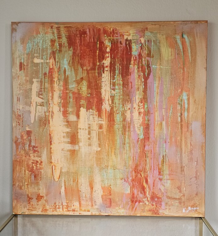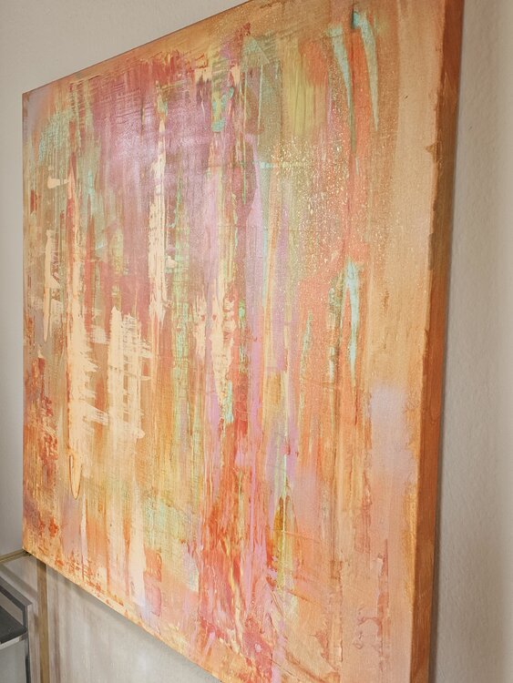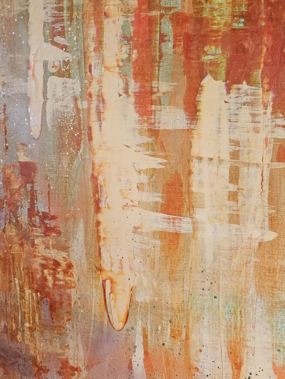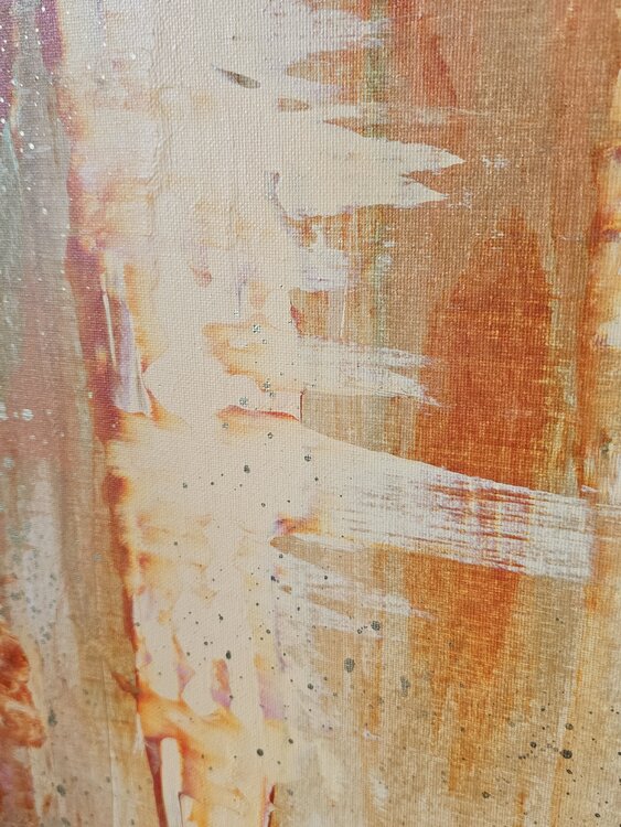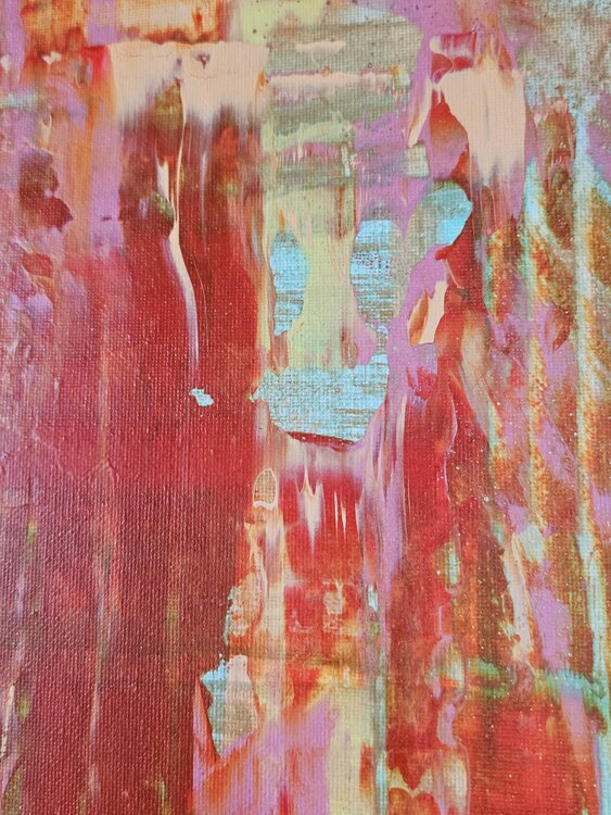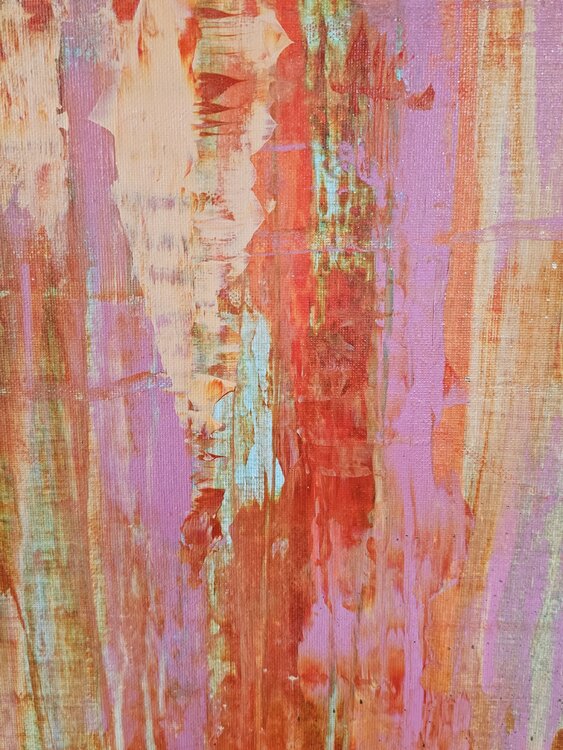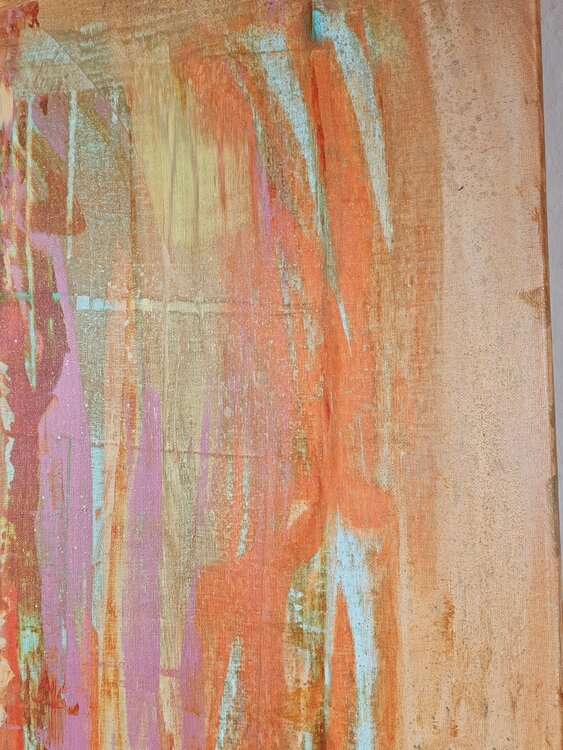 The painting shows a cheerful scene with bright colors of orange and pink. The colors create a summery feeling and radiate warmth. The image could depict a sunny landscape, a blooming garden or a happy summer party. The vibrant colors and dynamic composition convey a feeling of joy and lightness. The painting invites the viewer to immerse themselves in the warm and happy mood of summer.