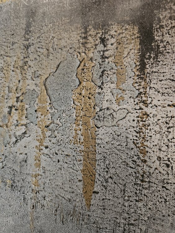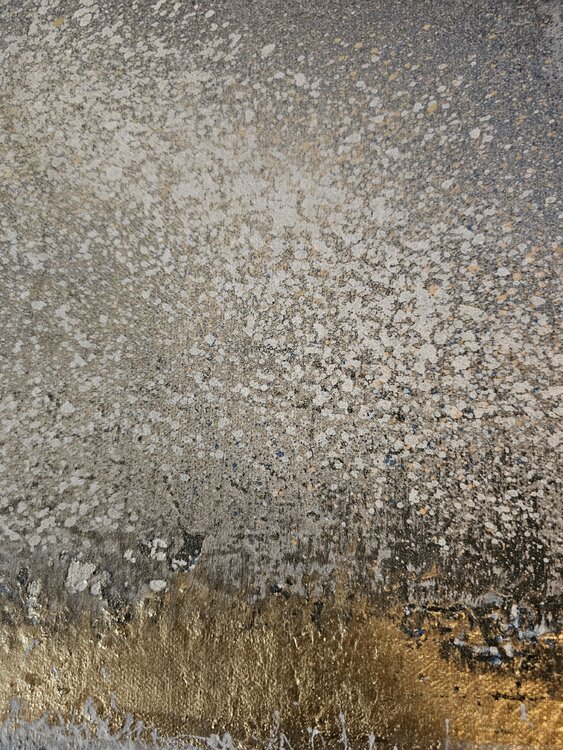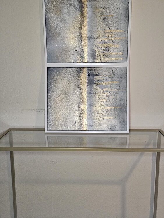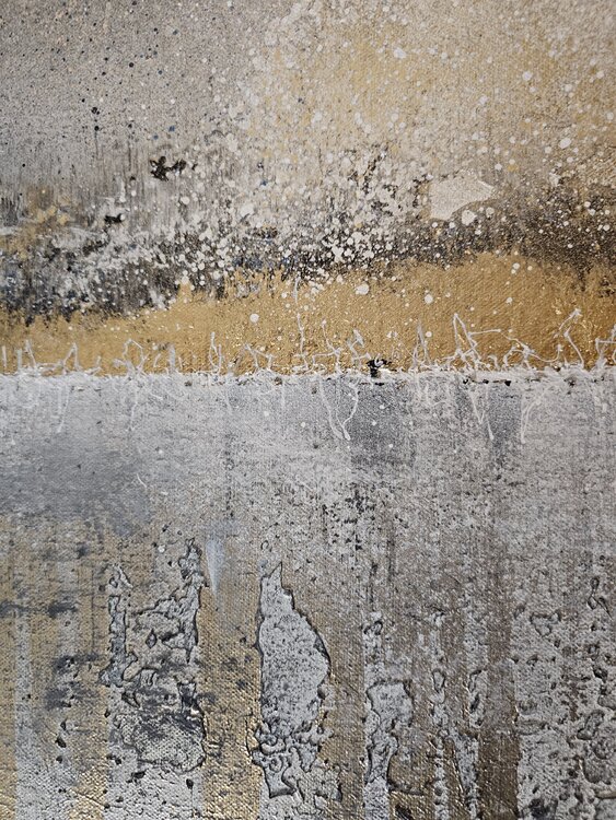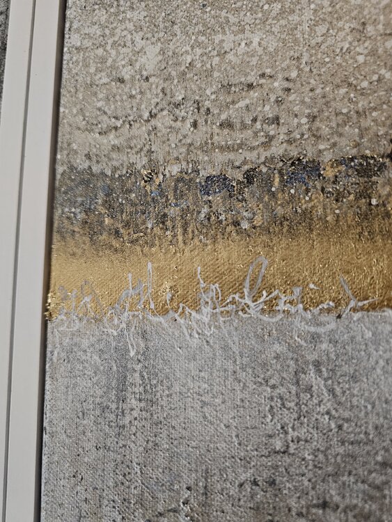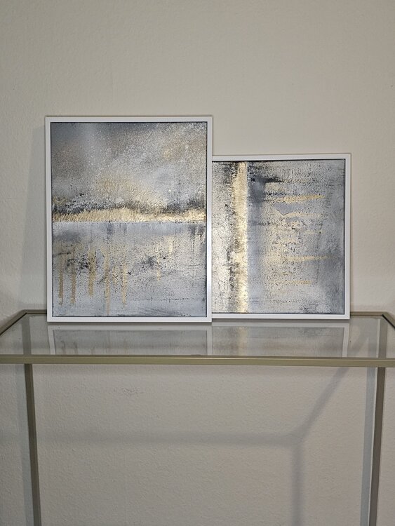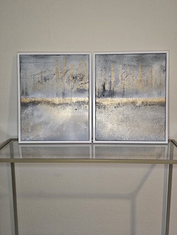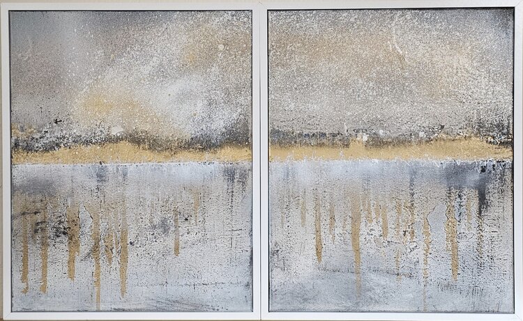 The abstract diptych shows clear golden elements that are presented in a harmonious interplay. The colors and shapes appear elegant and noble, perfect for a simple interior with a touch of sophistication. The two parts of the artwork complement each other and create an appealing atmosphere in the room. An eye-catcher for any room designed with style and elegance.