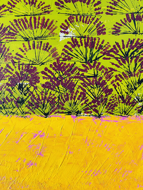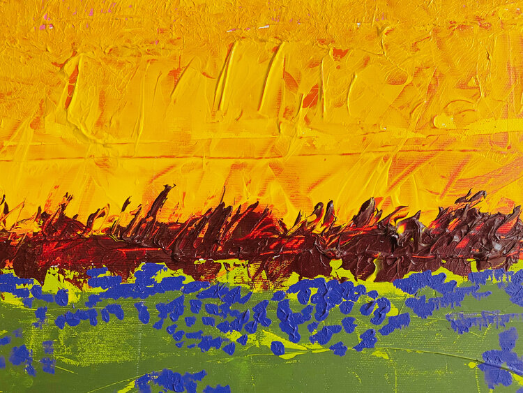 Province with its lavender fields has always been very inspiring. The magical atmosphere is full of calm, the light and the colors just invite you to paint. The picture was taken right in the field, in the middle of the sunshine, singing birds and buzzing bees. The warm, strong colors and the scent were breathtaking, the artist's soul was enthusiastic. You could only grab brushes, spatulas and acrylic paints and get started.
