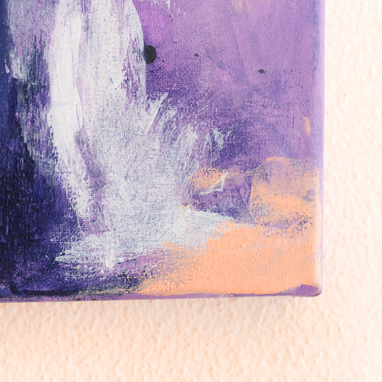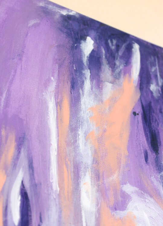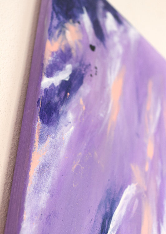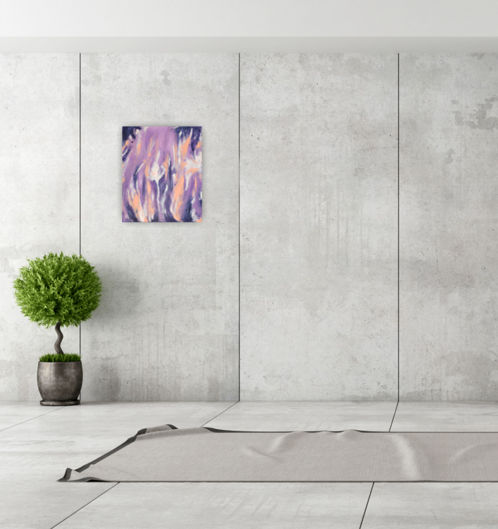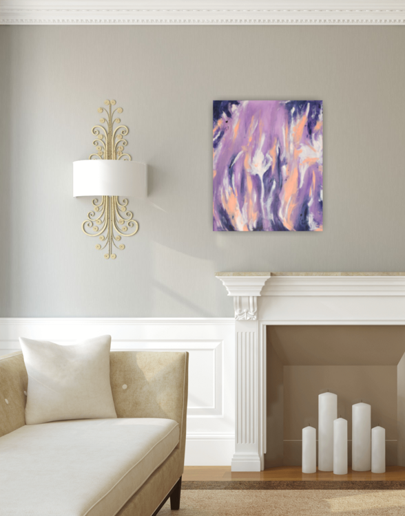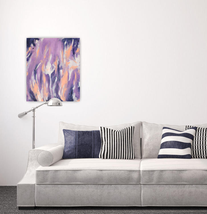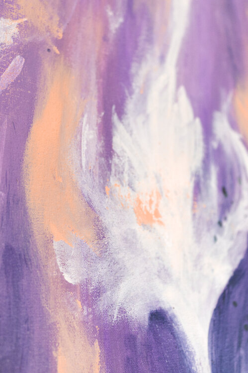 The painting "Redemption" is perfect for a feel-good place to rest and relax. The color scheme of dreamy lavender, enchanting blue, luminous apricot and subtle white exudes a soothing harmony, complemented by a barely discernible hint of shimmering pearl colour.