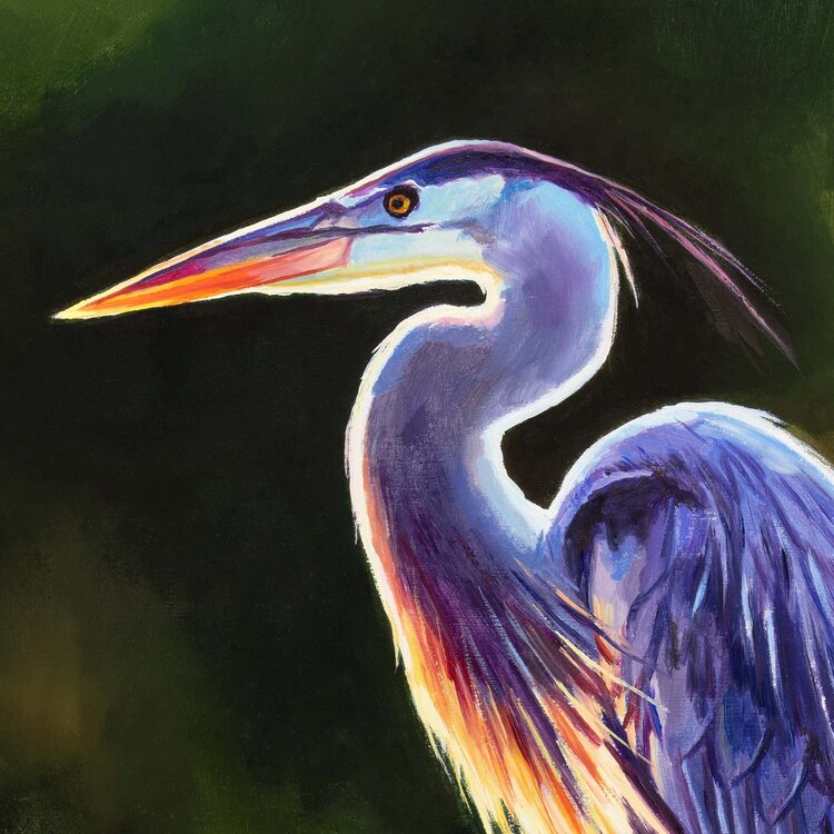 Blue heron bird portrait painting. This is a lake bird oil painting drawing of a great blue heron in a marsh land context. This wetland wildlife artwork is perfect for a lake house, and a great bird lover gift.