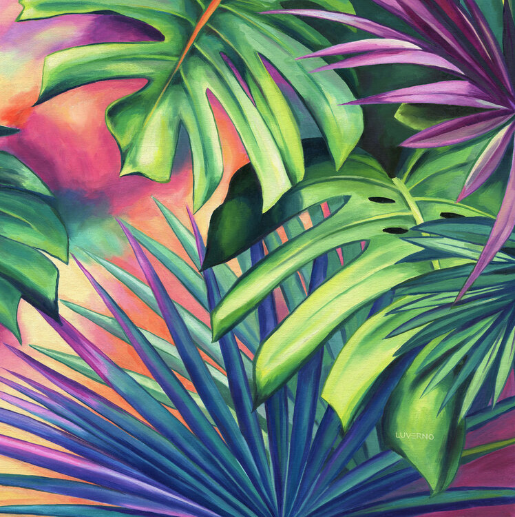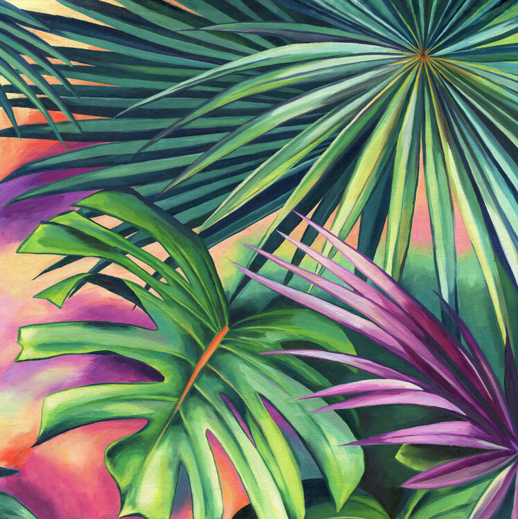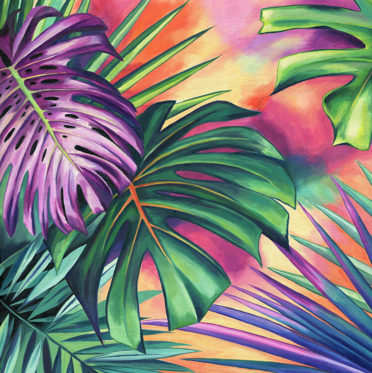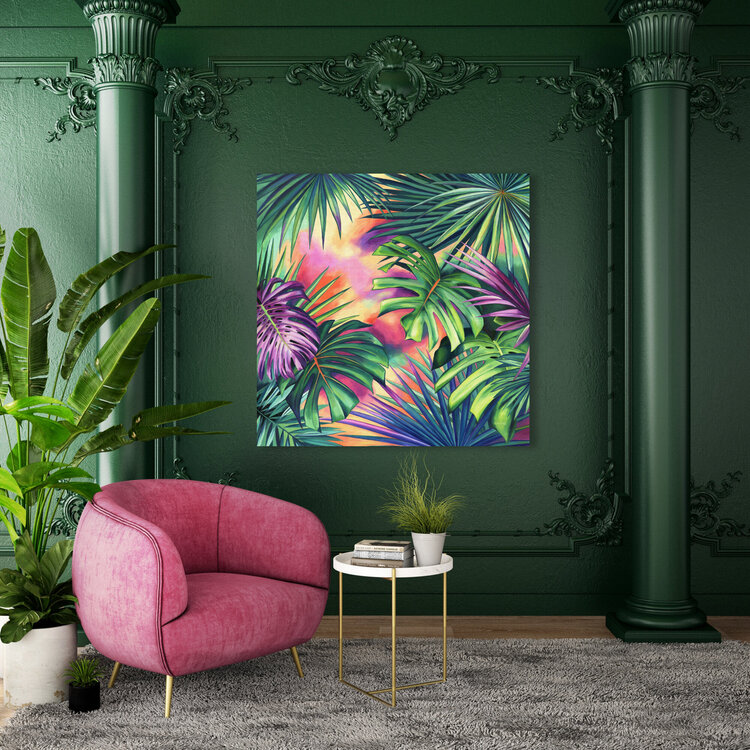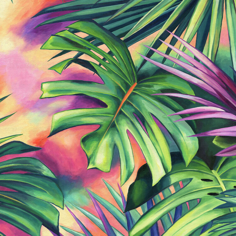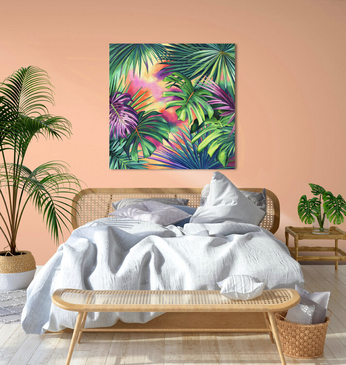 The monstera and palmetto leaves of this abstract botanical artwork create a fantasy jungle vibe. The lively orange, green and pink tones look fresh and playful to the eyes.