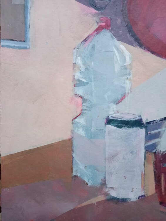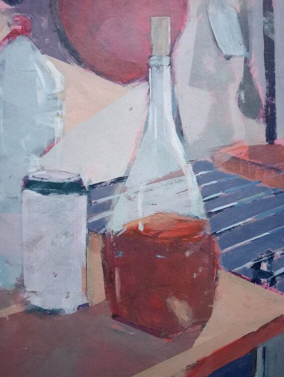 Still life consisting of a bottle of water, canned beer and vin santo.