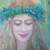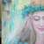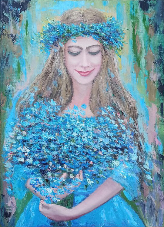 The girl wears a crown of flowers, which elegantly adorns her hair, adding a touch of freshness and nature to her figure. In her hands she holds a bouquet of blue1