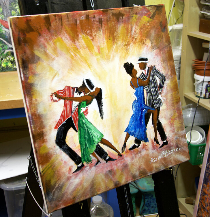 Tango (acrylic on canvas 50x50). I do not know how to dance (or rather I am the negation of any dance) but it is enough for me to see him dance well to realize that the dancers seem to have our face and that those figures represent, from the beginning of the world, the movement, the relationship. and the attitude of the human couple: sensuality, emotion, energy, breathing, embrace, palpitation.