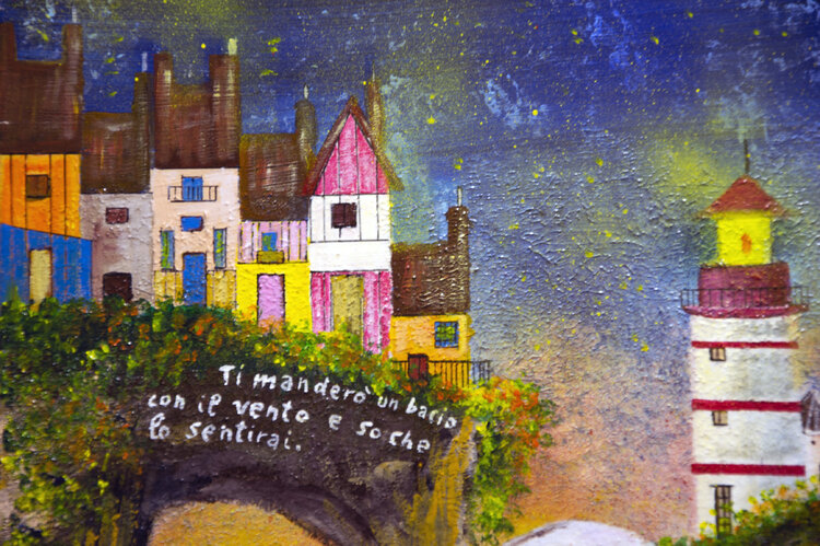 I will send you a kiss (acrylic 50x50). Pablo Neruda wrote “I will send you a kiss with the wind and I know you will feel it. You will turn around without seeing me but I will be there ”. When I read this poem I felt the kiss or rather the lick on the face of a sweet little dog of mine who left me a few years ago and is now barking in the wind. Lacrimuccia.