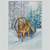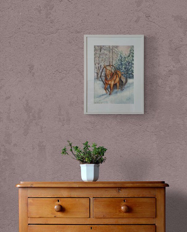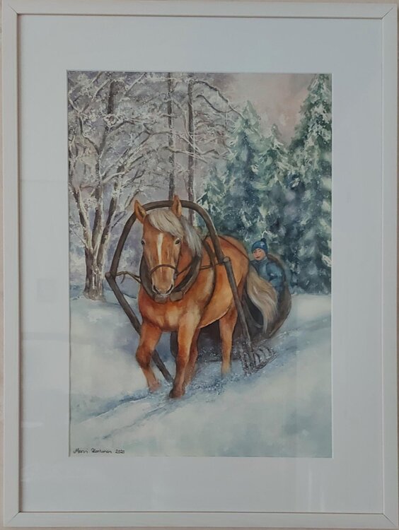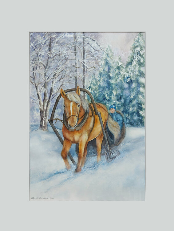 Watercolor and gouache painting of a Finnish horse on a sleigh ride in a traditional Finnish winter landscape.