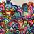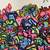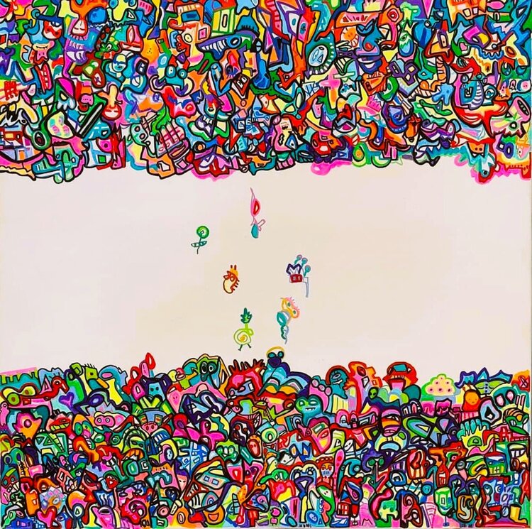 The artwork titled “Free Fall” is the fifth piece in a series that explores the concept of falling through abstract representation. It depicts a scene where numerous characters, outlined by irregular shapes and a very varied palette of colors, seem to be in full downward movement. The colors used are bright and contrasting, with a predominance of primary hues mixed with more vibrant and neon shades. These figures are arranged to create a dense top1
