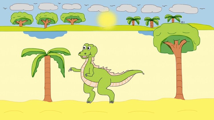 Colored Happy Dinosauriërs drawn withe the mouth mouse (Canvas size 20 x 30 cm )