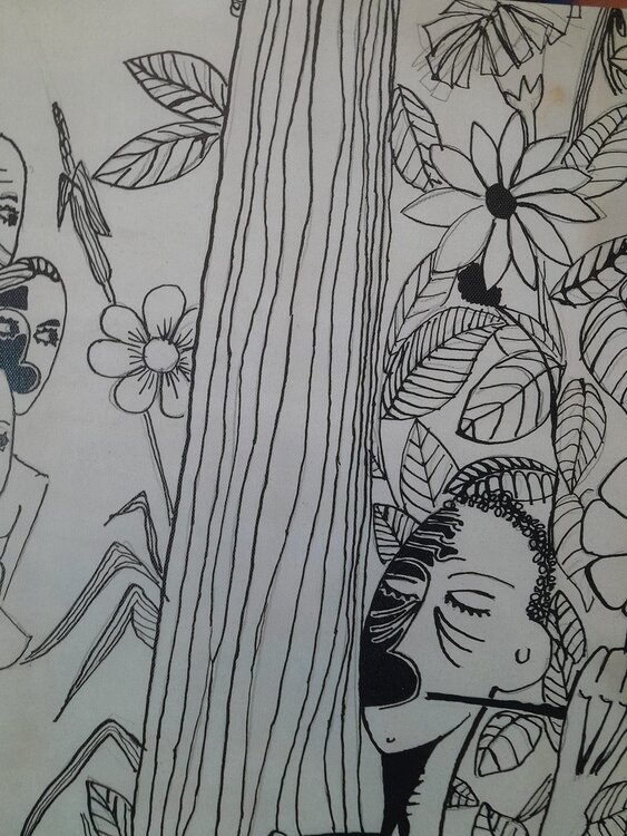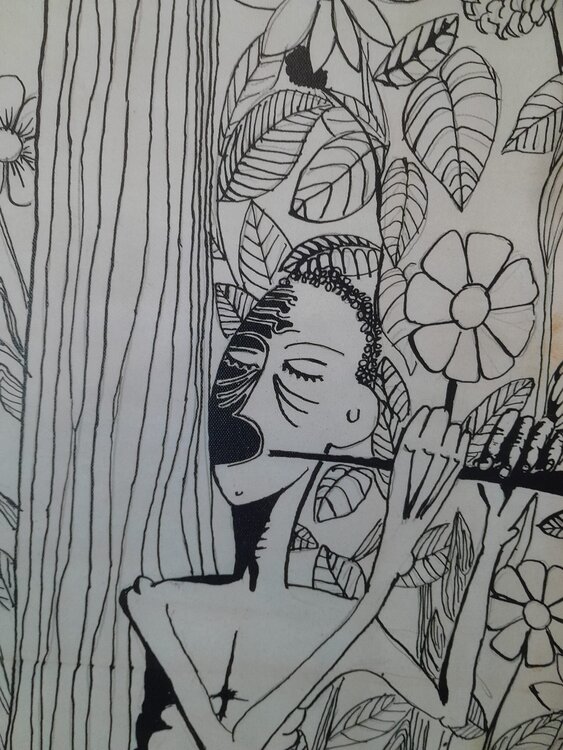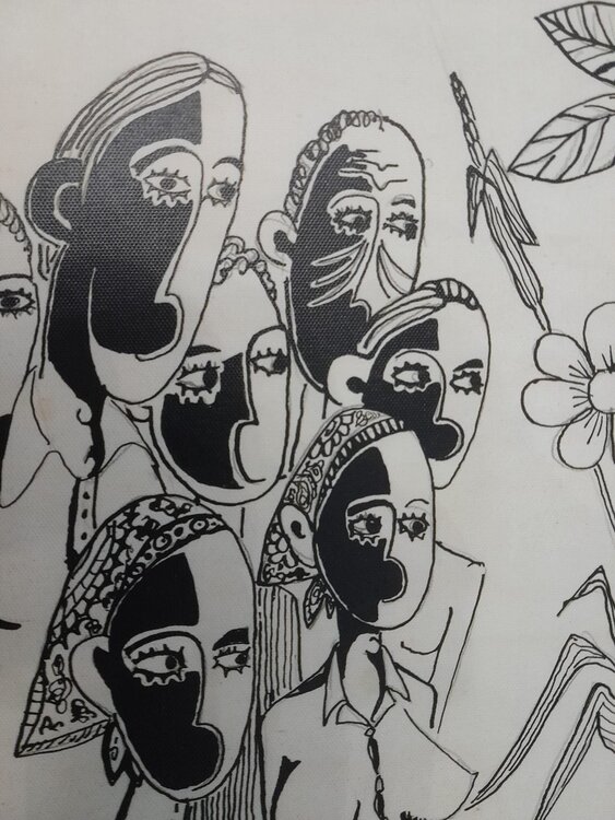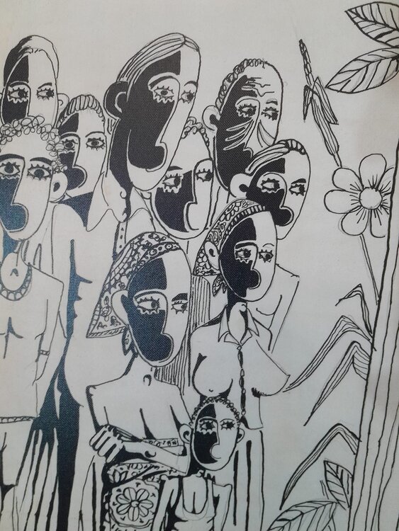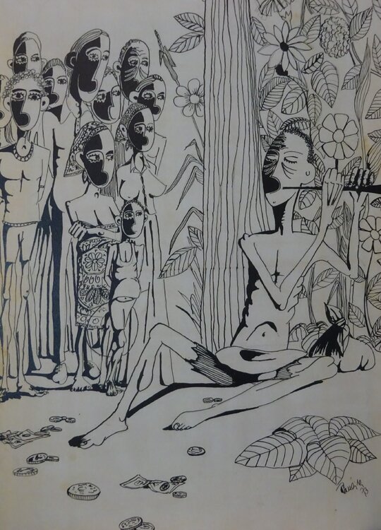 Is a 1973 drawing by Rui Carreira in Mozambique, in the city of Beira. It is a young "white" man's vision of the "African reality".
