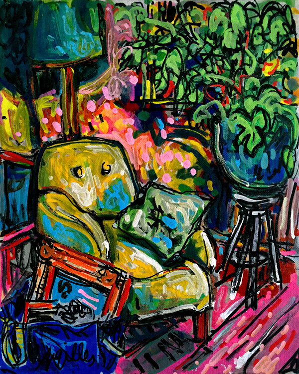 I painted this yellow armchair in an apartment in Saint-Etienne with a green monstera plant next to it.
