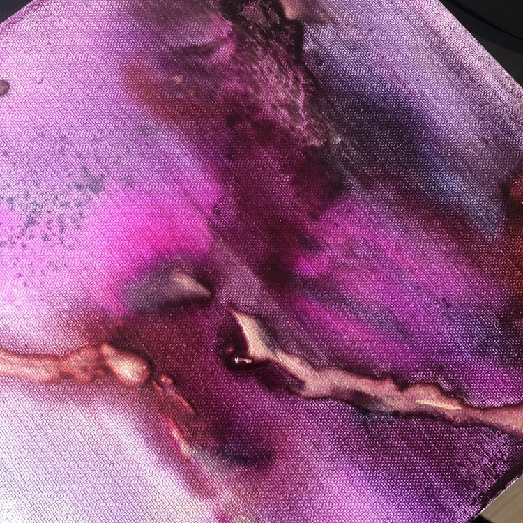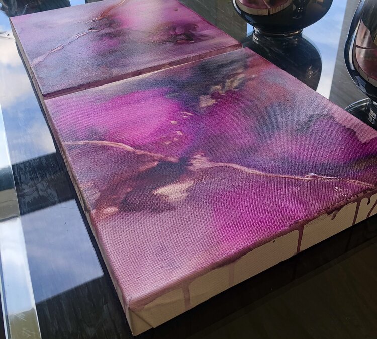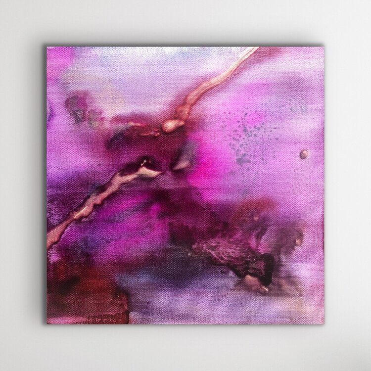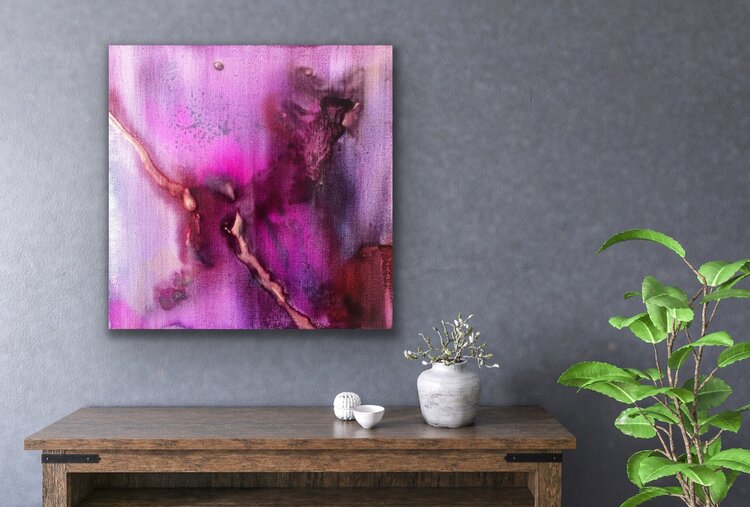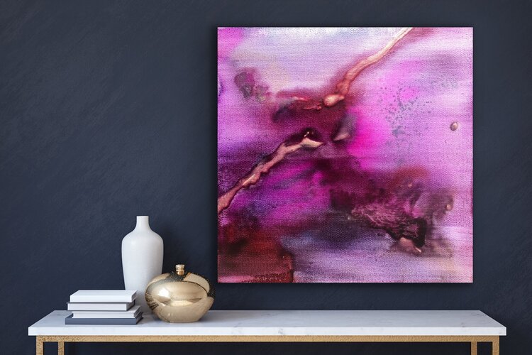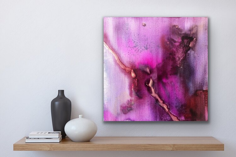Intuitive watercolor technique with acrylic ink, varnished. Shades of wine red, pink, bordeaux red, shades of purple, gold, anthracite. Modern painting with dynamic color transitions. An original abstract work of modern art skilfully stages your living space and is always an eye-catcher. The original work of art is painted on canvas and stretched over a sturdy wooden stretcher frame. The picture can thus be hung directly.