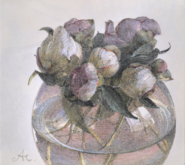 Bouquet of white and lilac peony buds in a round glass vase. The work is done with markers and colored pencils. The work is framed in a wide frame with glass and passepartout. Frame dimensions 33x33cm