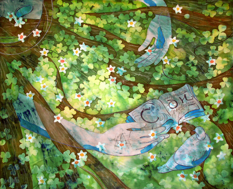 Continuation of the romantic story in a midday nap in the first warm greens. Cotton painting hand-painted in the batik technique.