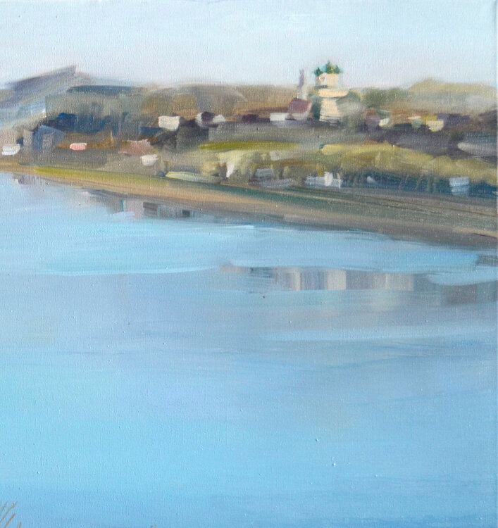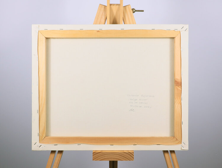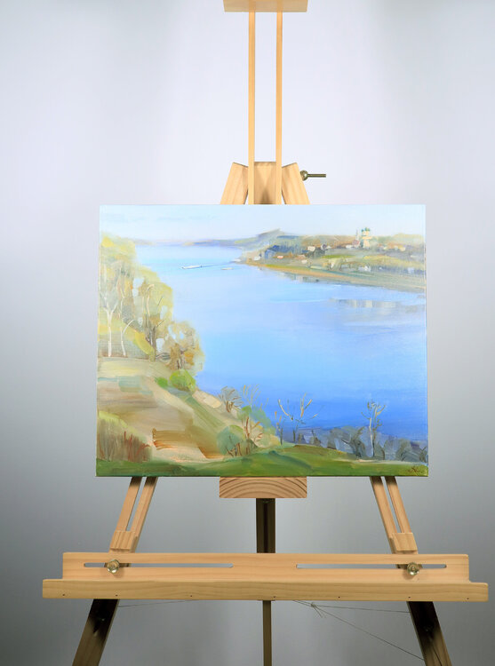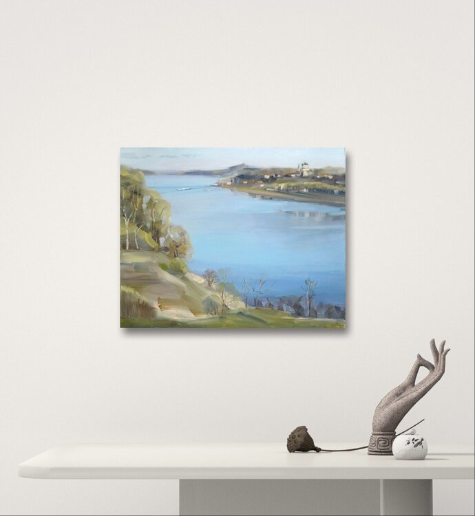 In this study, the tranquil beauty of the Volga River flowing through the historic town of Tutayev is captured. The peaceful blue of the river reflects the gentle light of a clear day and creates a soft contrast with the warm, earthy tones of the bank. The elegant spring trees in the foreground, the vast open sky, and the wide expanse of water carry hints of serenity and elegance, which will be appropriate in any setting.