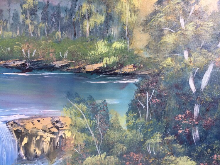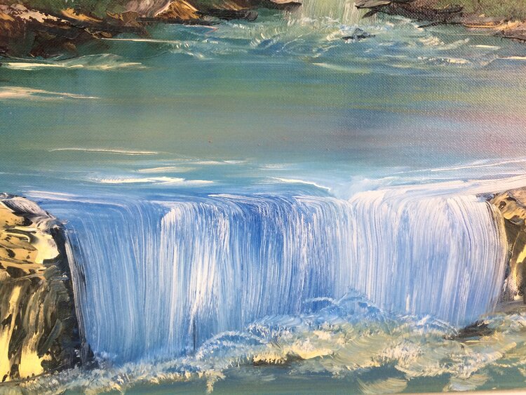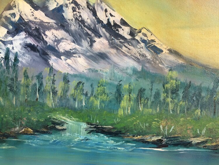Beautiful mountains with running water -PAINTED on canvas, sides painted, ready to hang on the wall./Unframed/ Ability to use without a frame. Ship with tracking number.