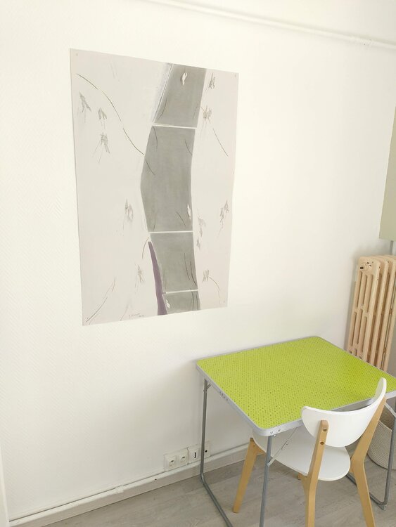 This drawing already contains the beginnings of the current works of the designer. It was made the year of preparation for the CAPES plastic arts competition - successful. Flat areas, collages and gray tone.