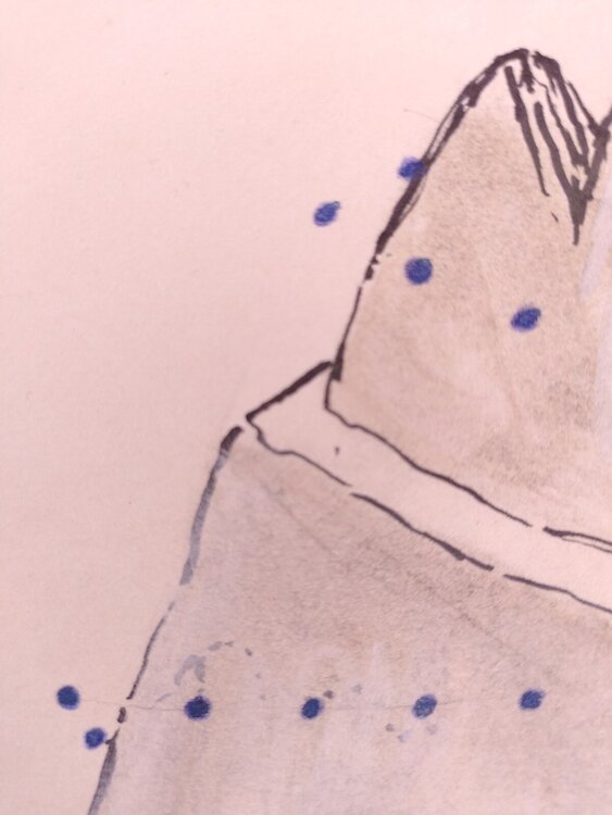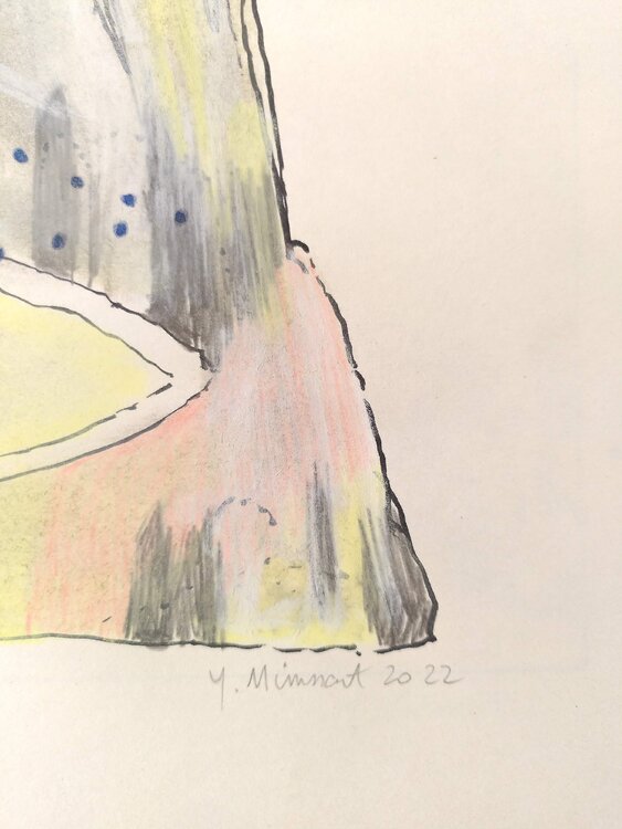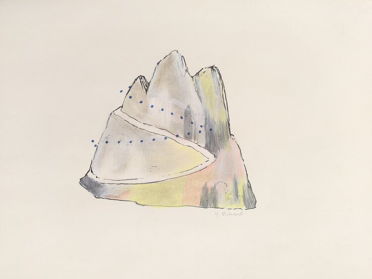 A path, the start and end of which you can't see, meanders around a mountain; as in the whole series, a string of blue dots symbolizes a human presence.
