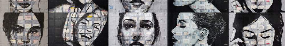 Retratos pintados sobre lienzos hechos ensamblando disquetes antiguos