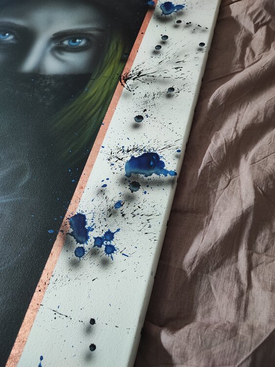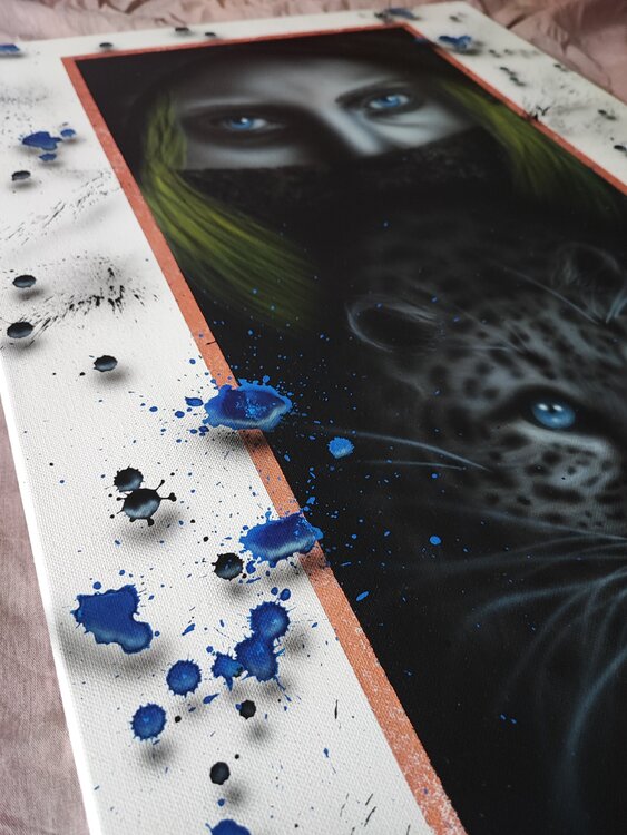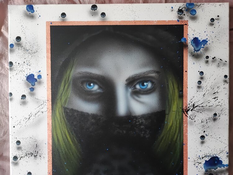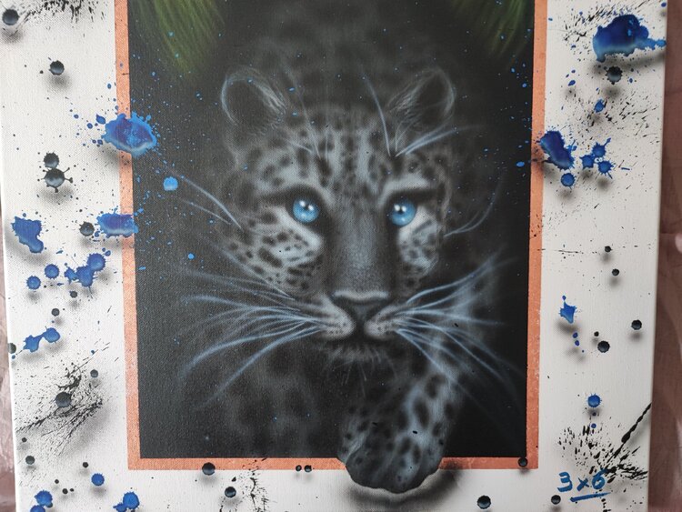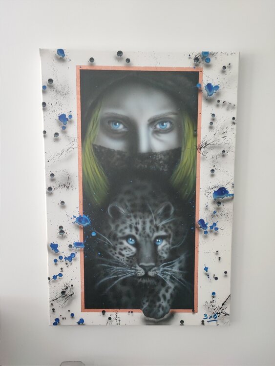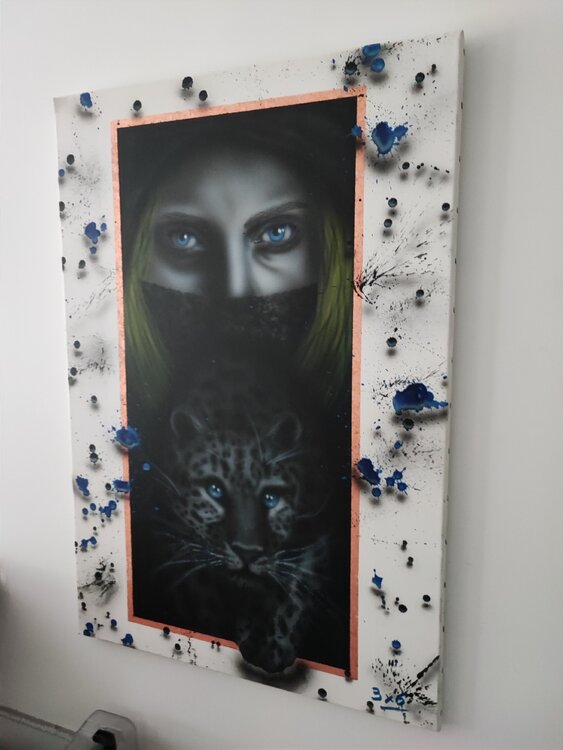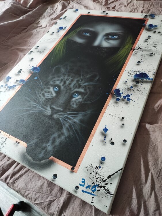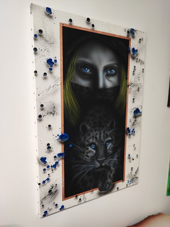 Trabajo realizado con aerógrafo y aerosol con virutas de cobre, sprays con sombras para dar efecto 3D, acabado en barniz satinado.