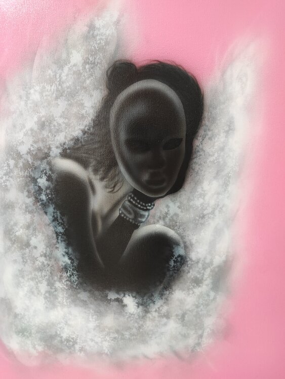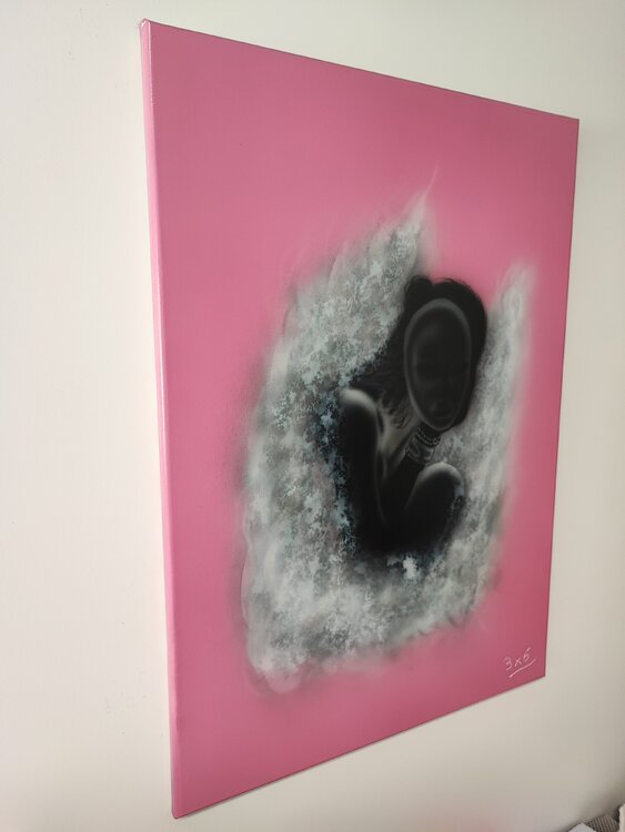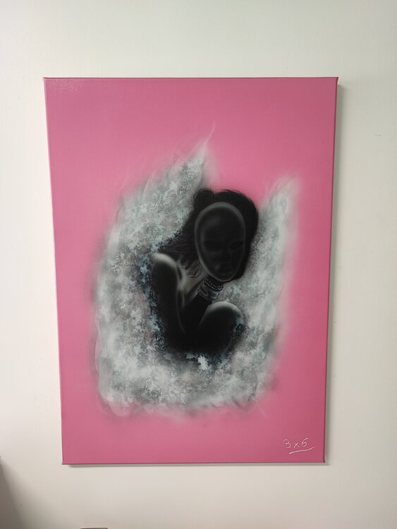 Obra realizada con aerógrafo y aerosol con acabado en barniz brillante.