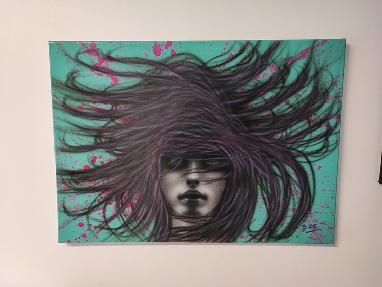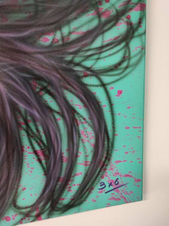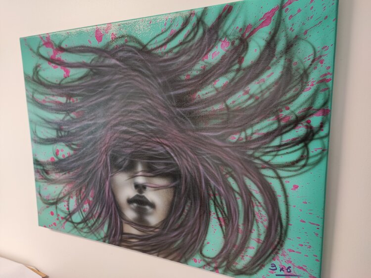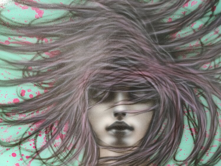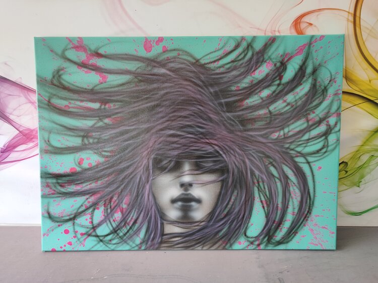 Trabajo realizado con aerógrafo y aerosol con chorros, acabado en barniz brillante.