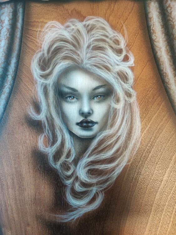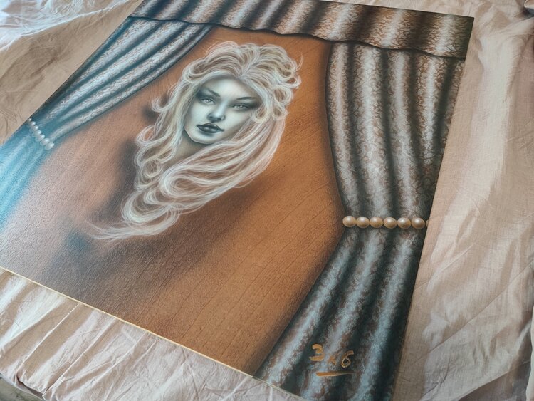 Trabajo realizado con aerógrafo y aerosol, buena combinación con madera barnizada satinada.