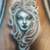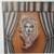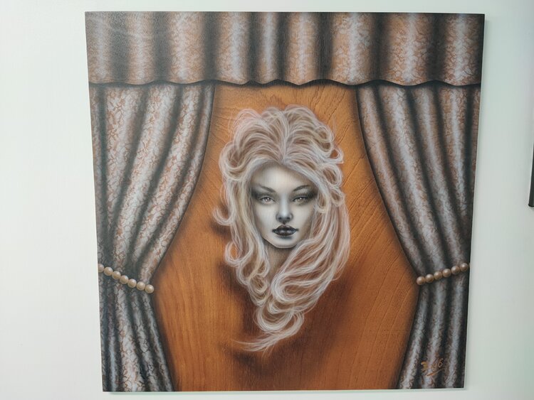 Pequeña cortina de mezcla de encaje sobre un fondo de madera con un intimidante rostro de mujer en el centro.